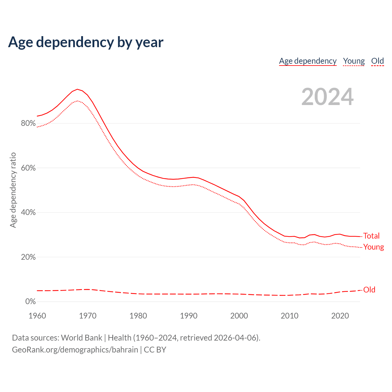 Data sources: World Bank | Health (1960–2024, retrieved 2026-04-06); U.S. Census Bureau (1960–2024, retrieved 2026-02-08).