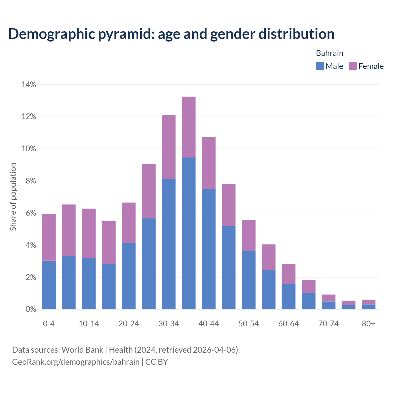 With a population of 1.59M people, Bahrain has a median age of 34.2 years which makes it the 80/196 oldest country. 18.7% of the demographic are children 0-14 years old, 77.4% are working-age people aged 15-64, and 3.85% are older population aged 65+ years.