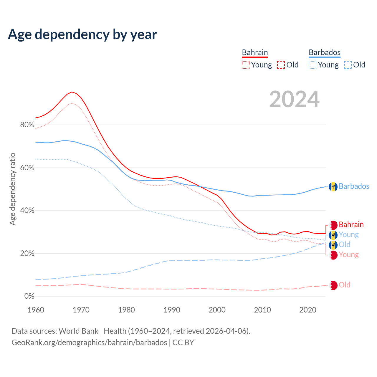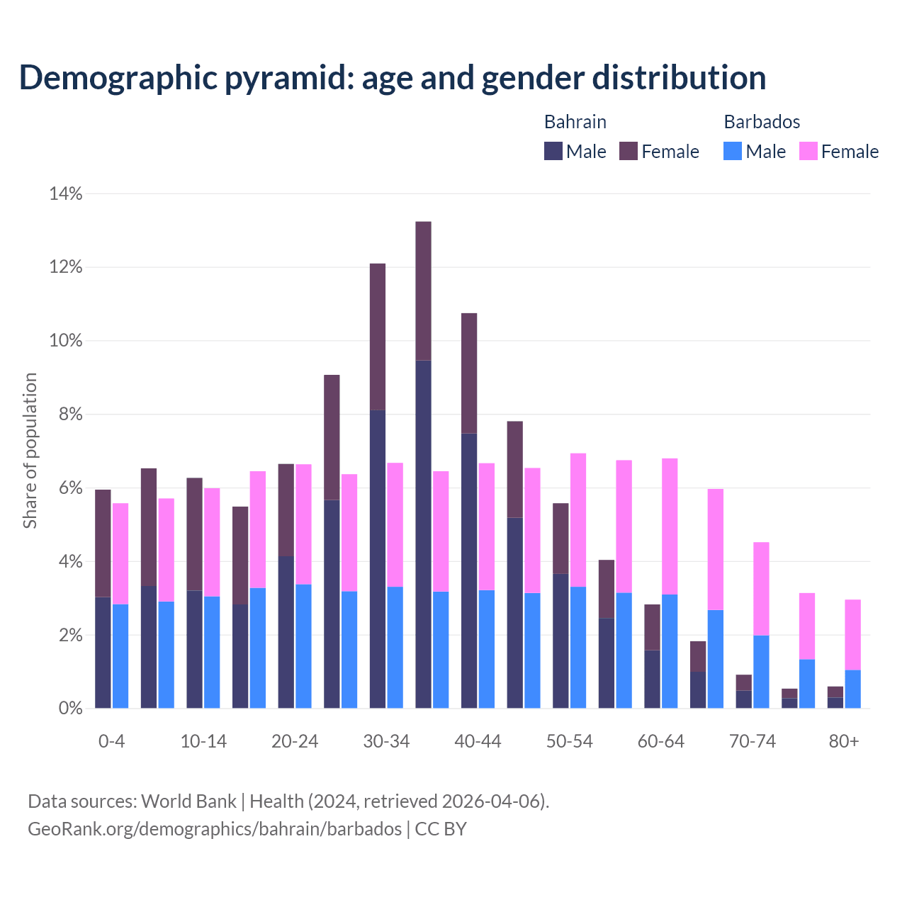 - Bahrain is ranked 80/196 by median age (oldest to youngest) vs 47/196 for Barbados.