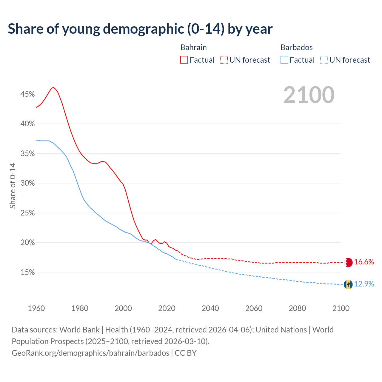 - The share of young demographic (0-15 years old) in Bahrain is 18.7% vs 17.2% in Barbados.