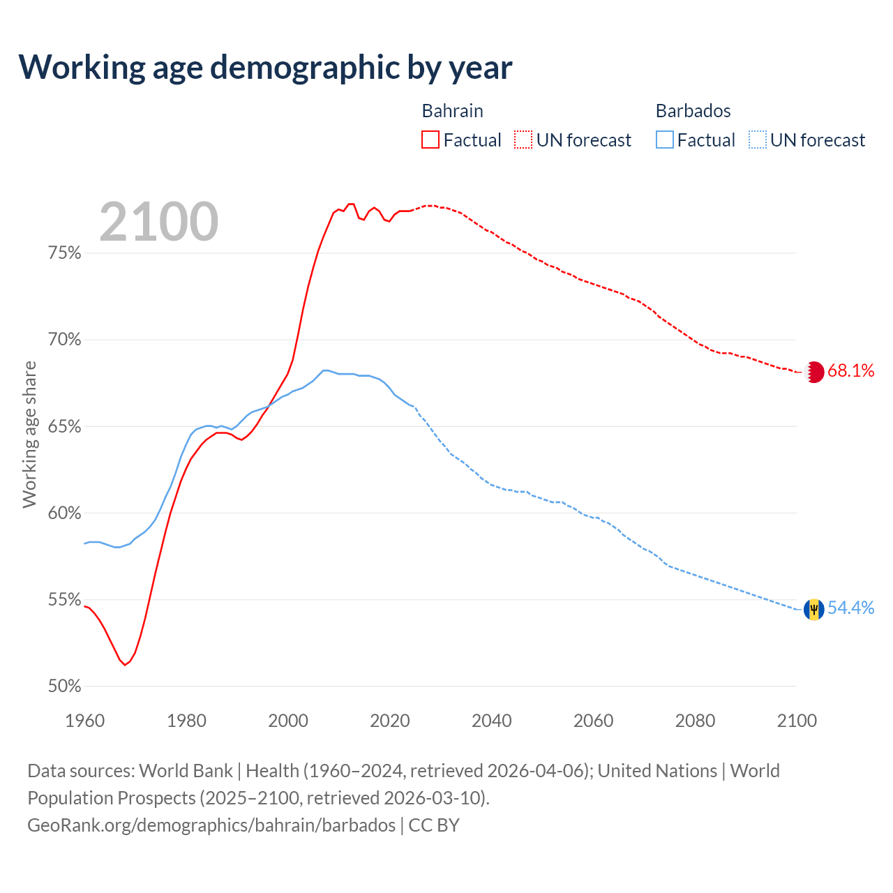 Median age Bahrain vs Barbados, 1960-2100