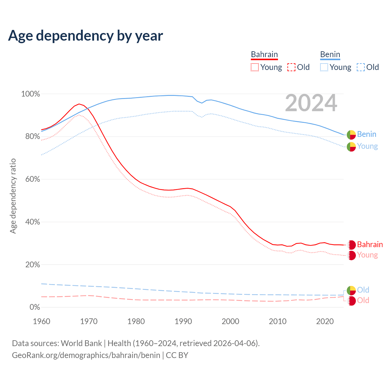 - Bahrain is ranked 80/196 by median age (oldest to youngest) vs 179/196 for Benin.