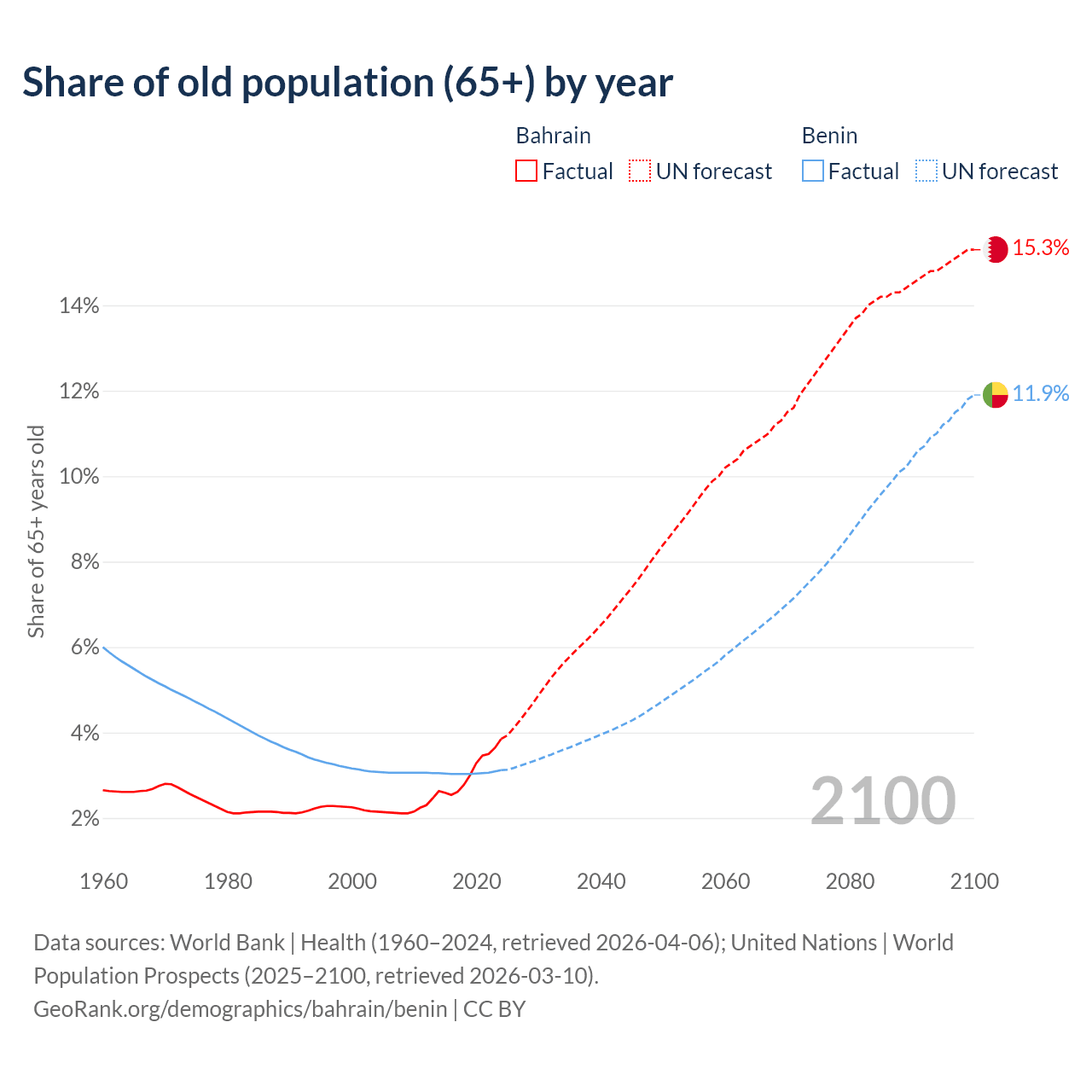 The share of older people aged 65 and over is 3.85% in Bahrain and 3.12% in Benin. Life expectancy in Bahrain compared to Benin .