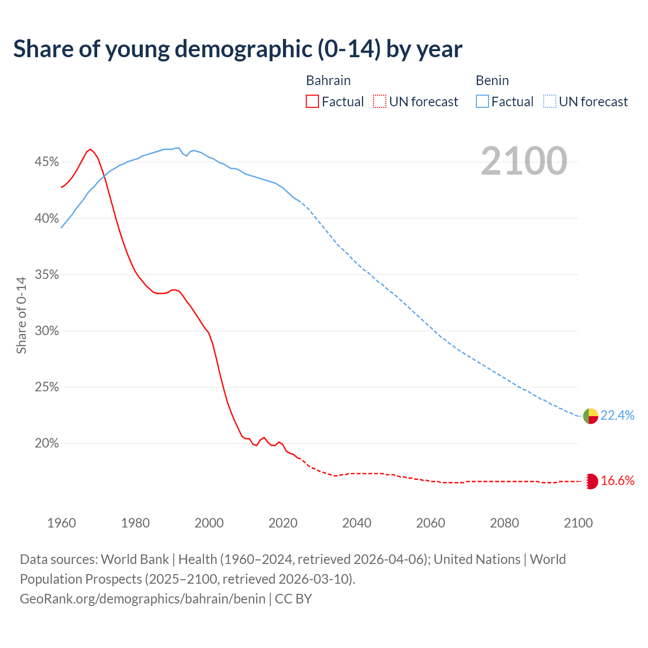 - The share of young demographic (0-15 years old) in Bahrain is 18.7% vs 41.6% in Benin.