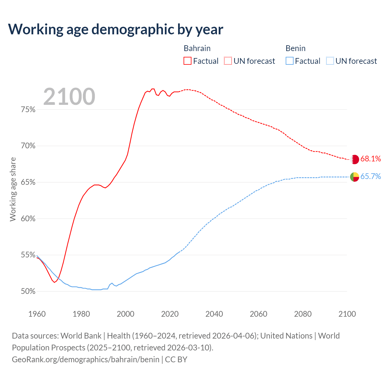 - Bahrain has 1.29M working age adults (aged 15-64) vs 8.45M in Benin.