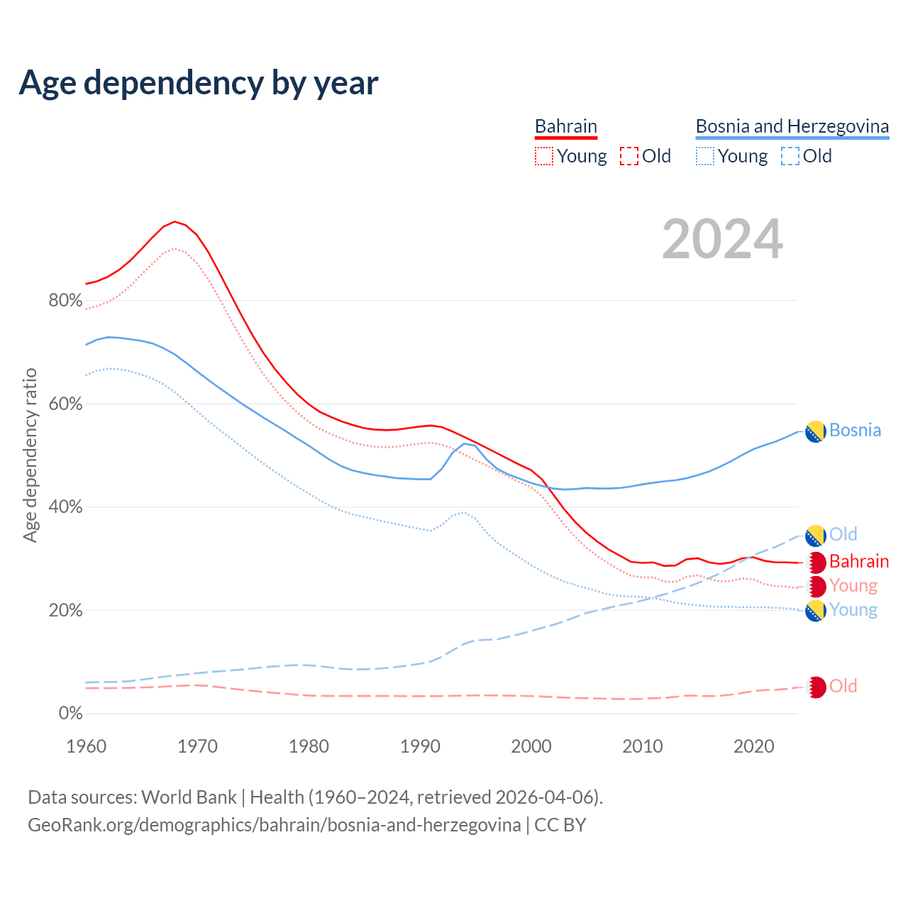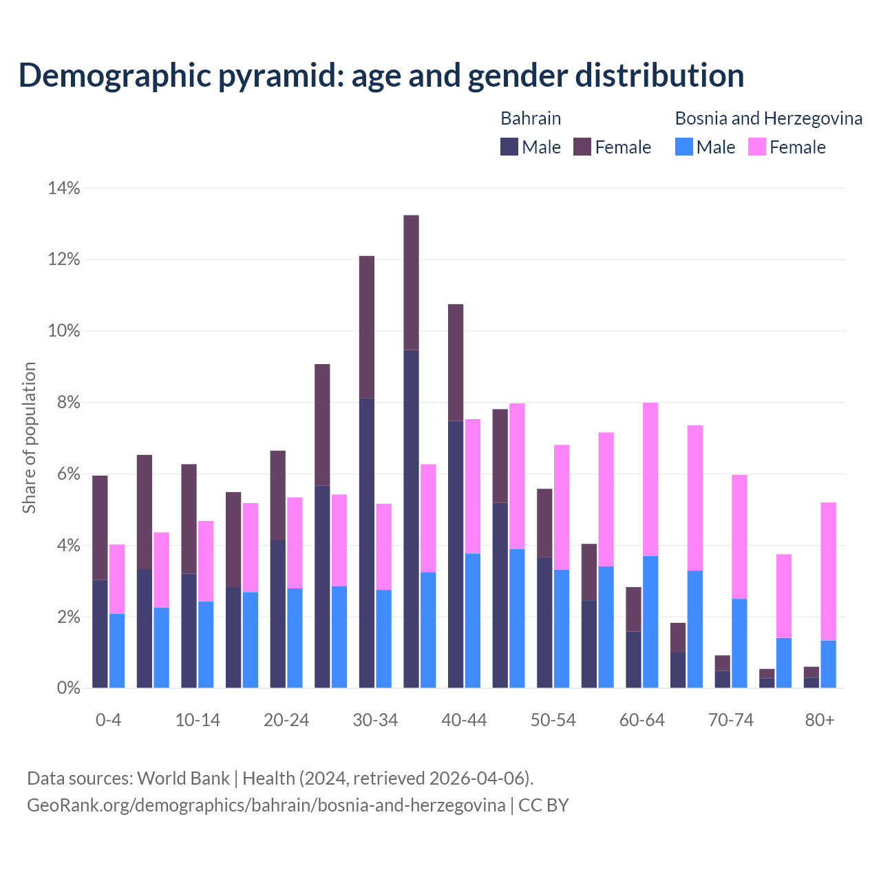 - Bahrain is ranked 80/196 by median age (oldest to youngest) vs 8/196 for Bosnia and Herzegovina.