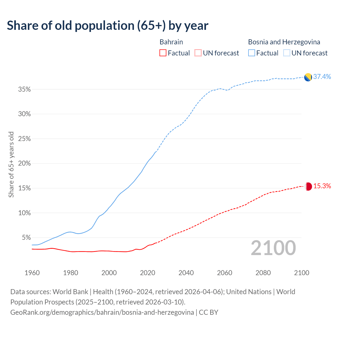 The share of older people aged 65 and over is 3.85% in Bahrain and 22.2% in Bosnia and Herzegovina. Life expectancy in Bahrain compared to Bosnia and Herzegovina .