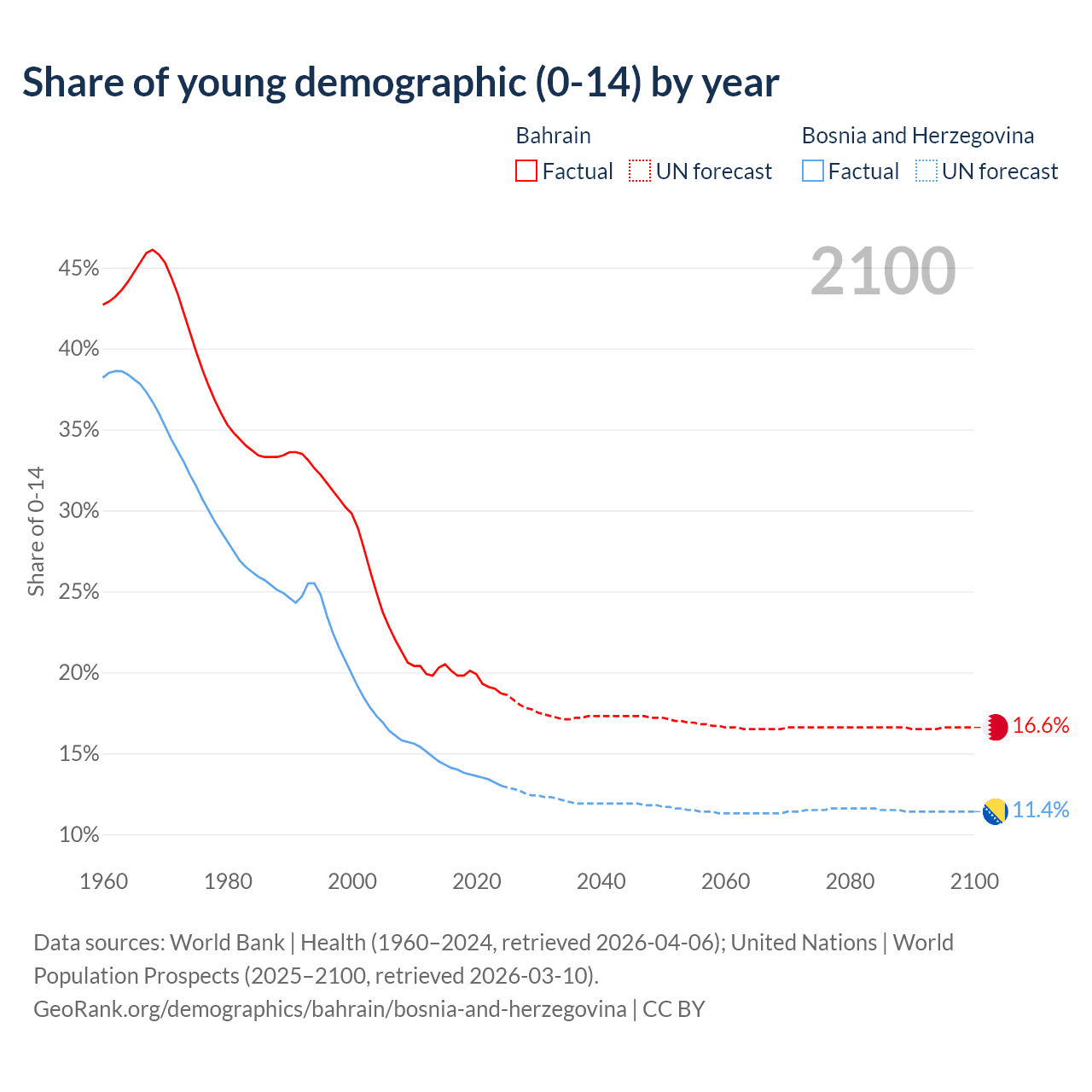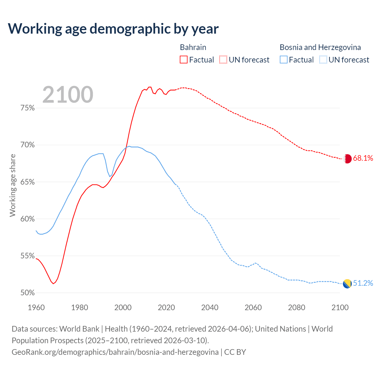 Median age Bahrain vs Bosnia and Herzegovina, 1960-2100