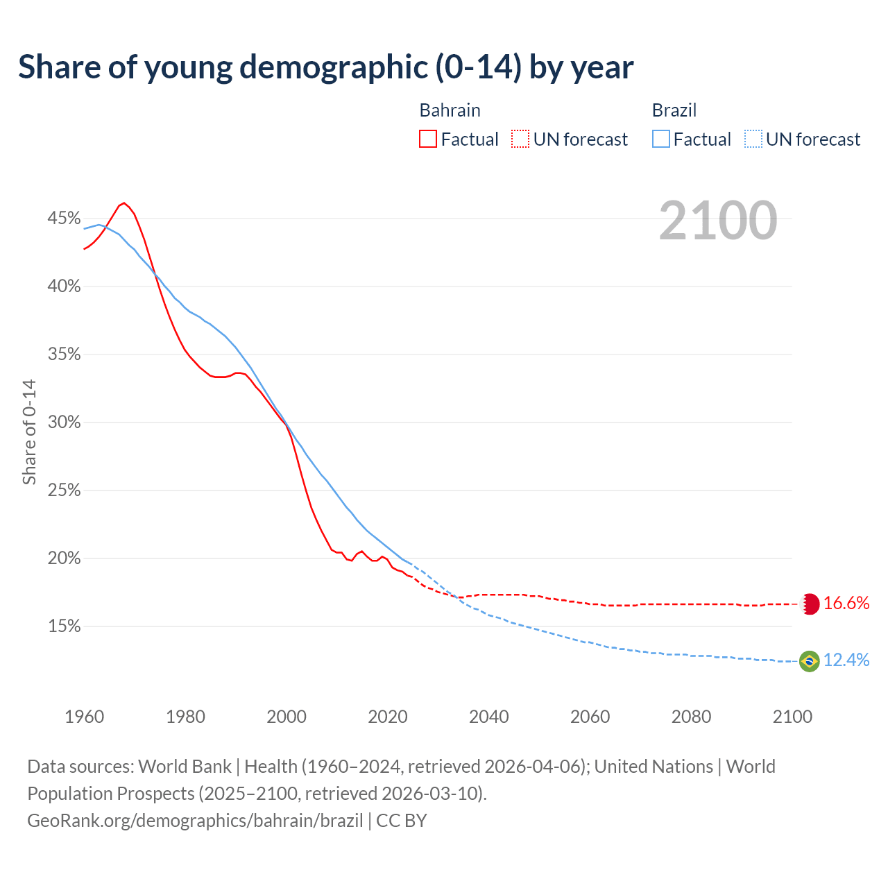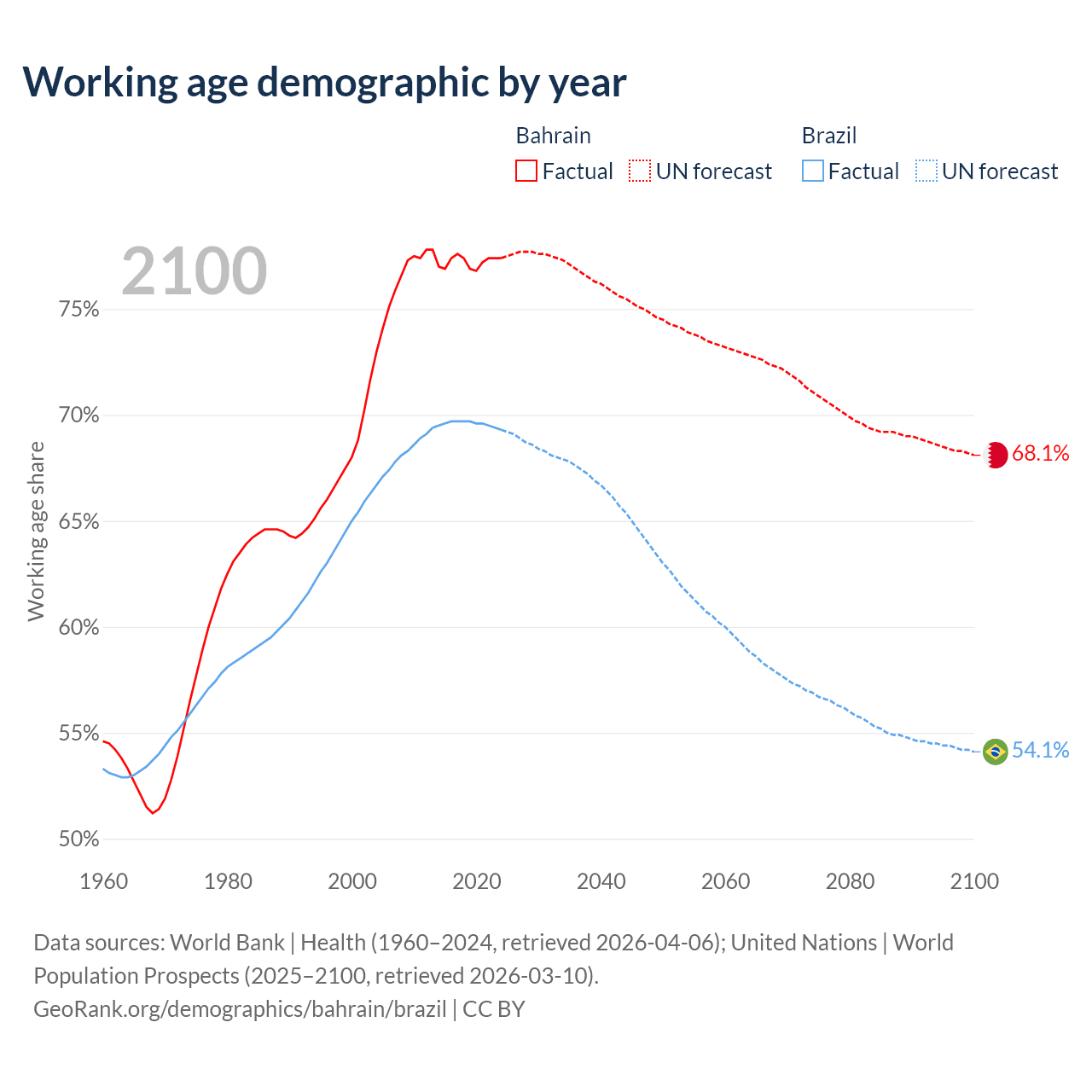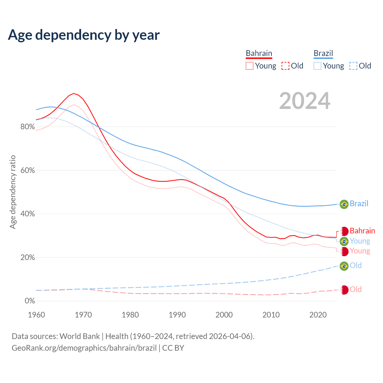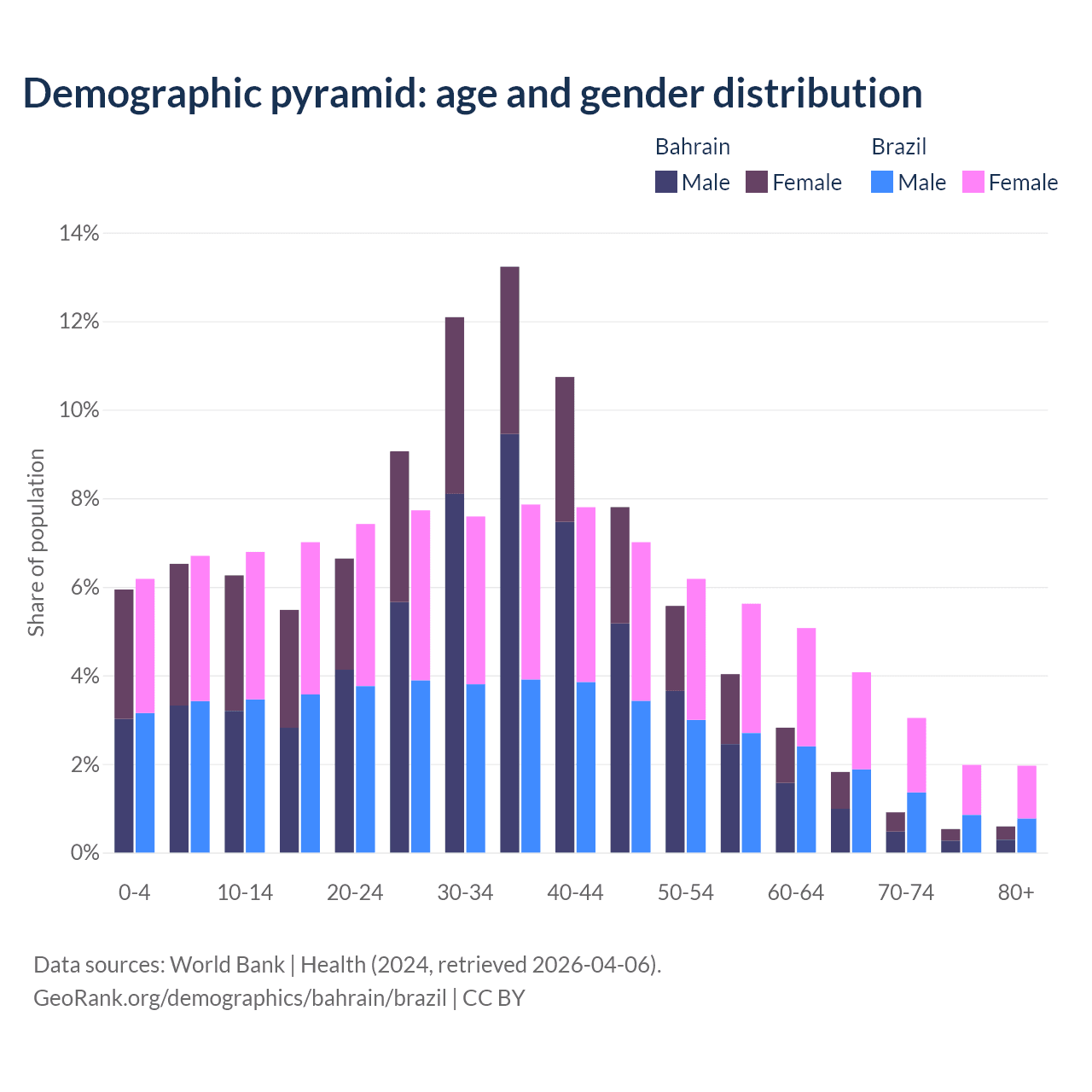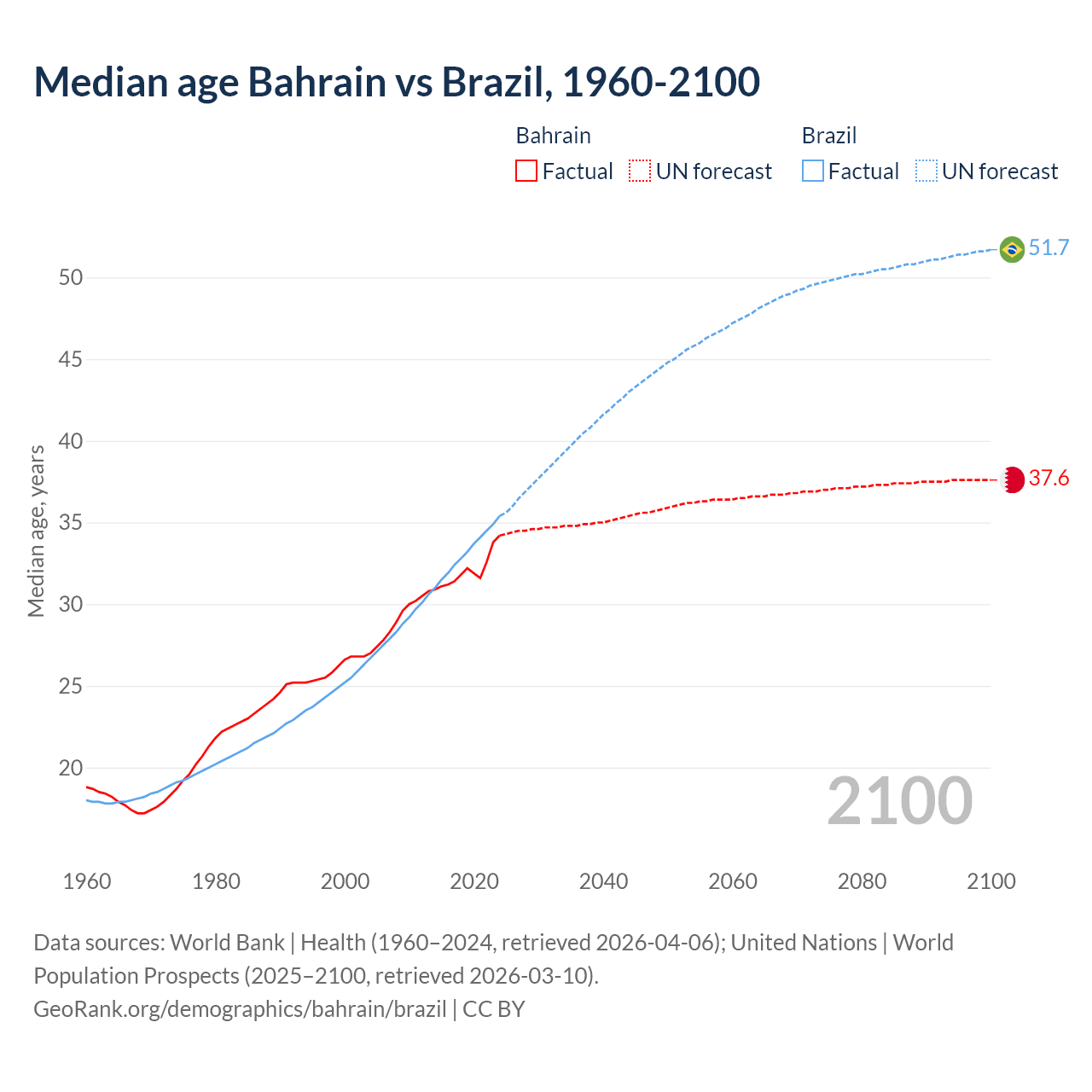 - Bahrain is ranked 80/196 by median age (oldest to youngest) vs 73/196 for Brazil.