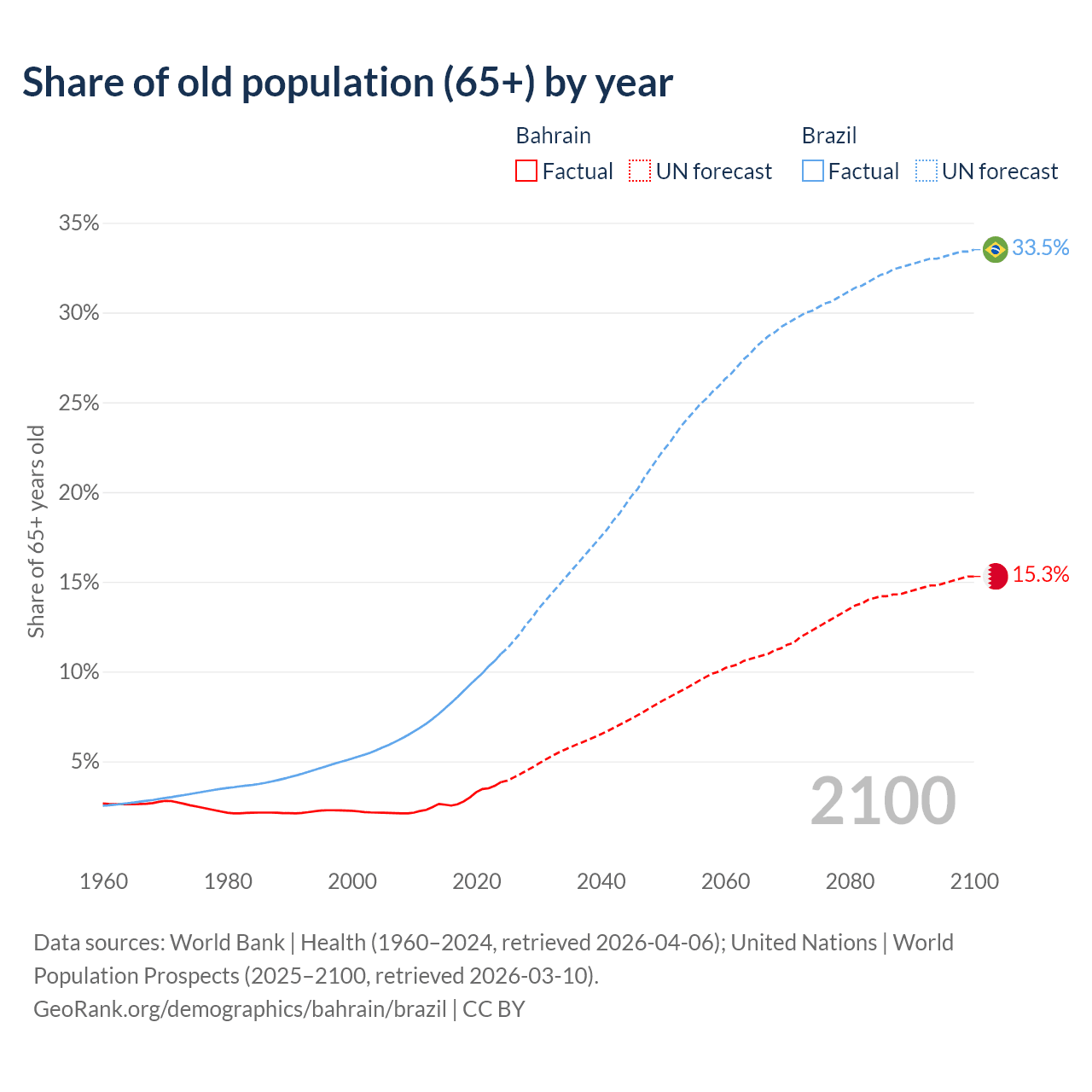 The share of older people aged 65 and over is 3.85% in Bahrain and 11% in Brazil. Life expectancy in Bahrain compared to Brazil .