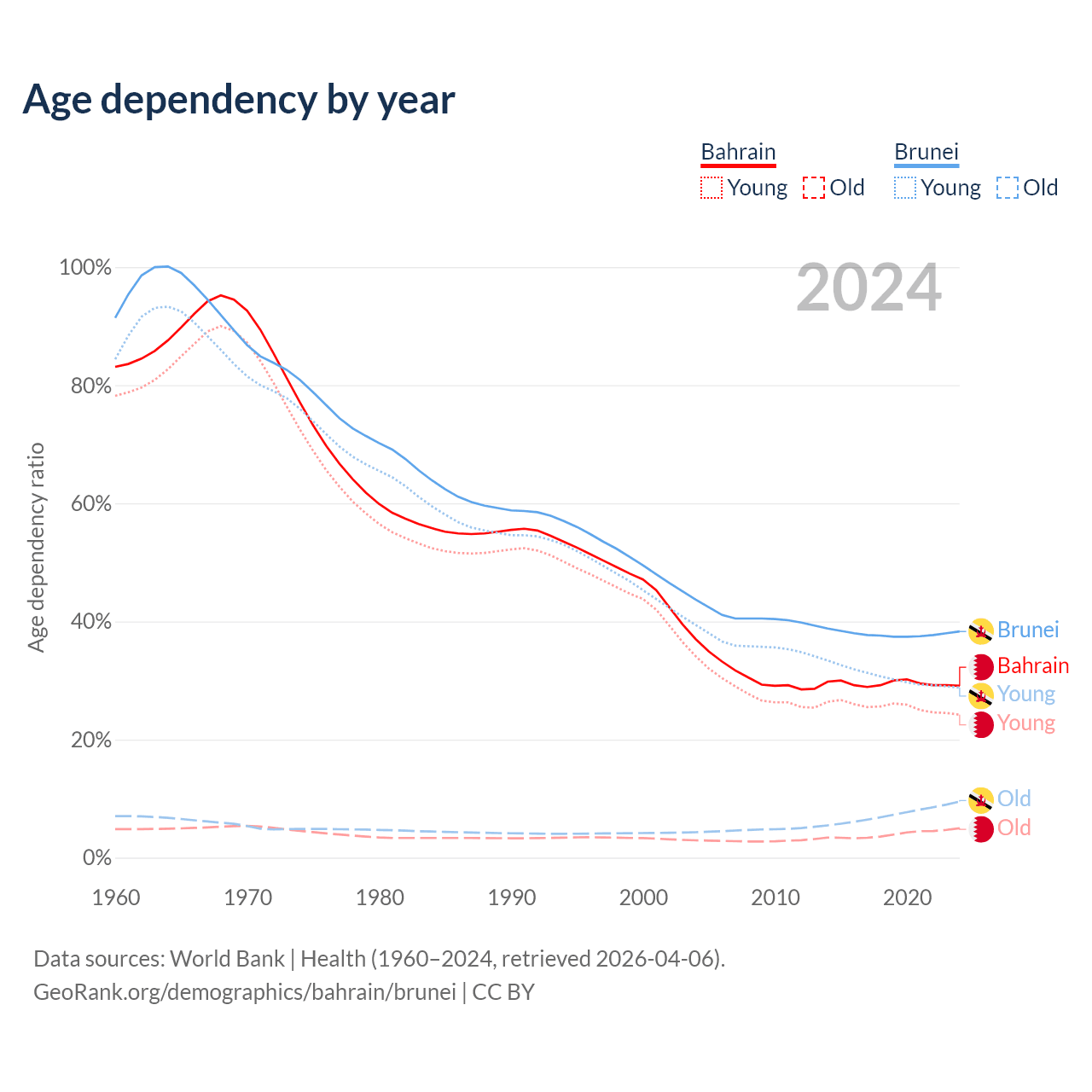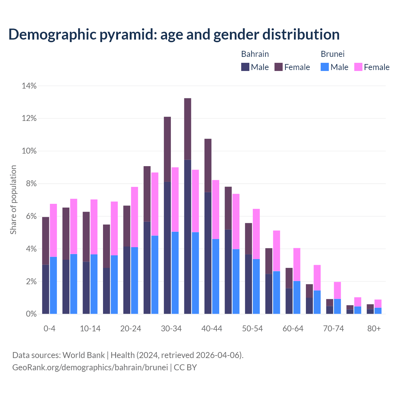 - Bahrain is ranked 80/196 by median age (oldest to youngest) vs 88/196 for Brunei.