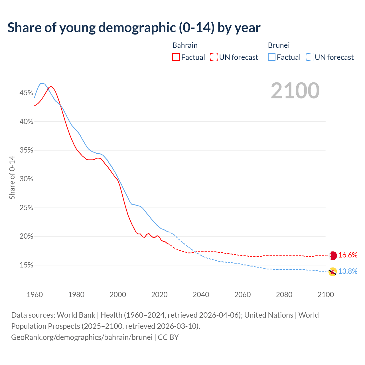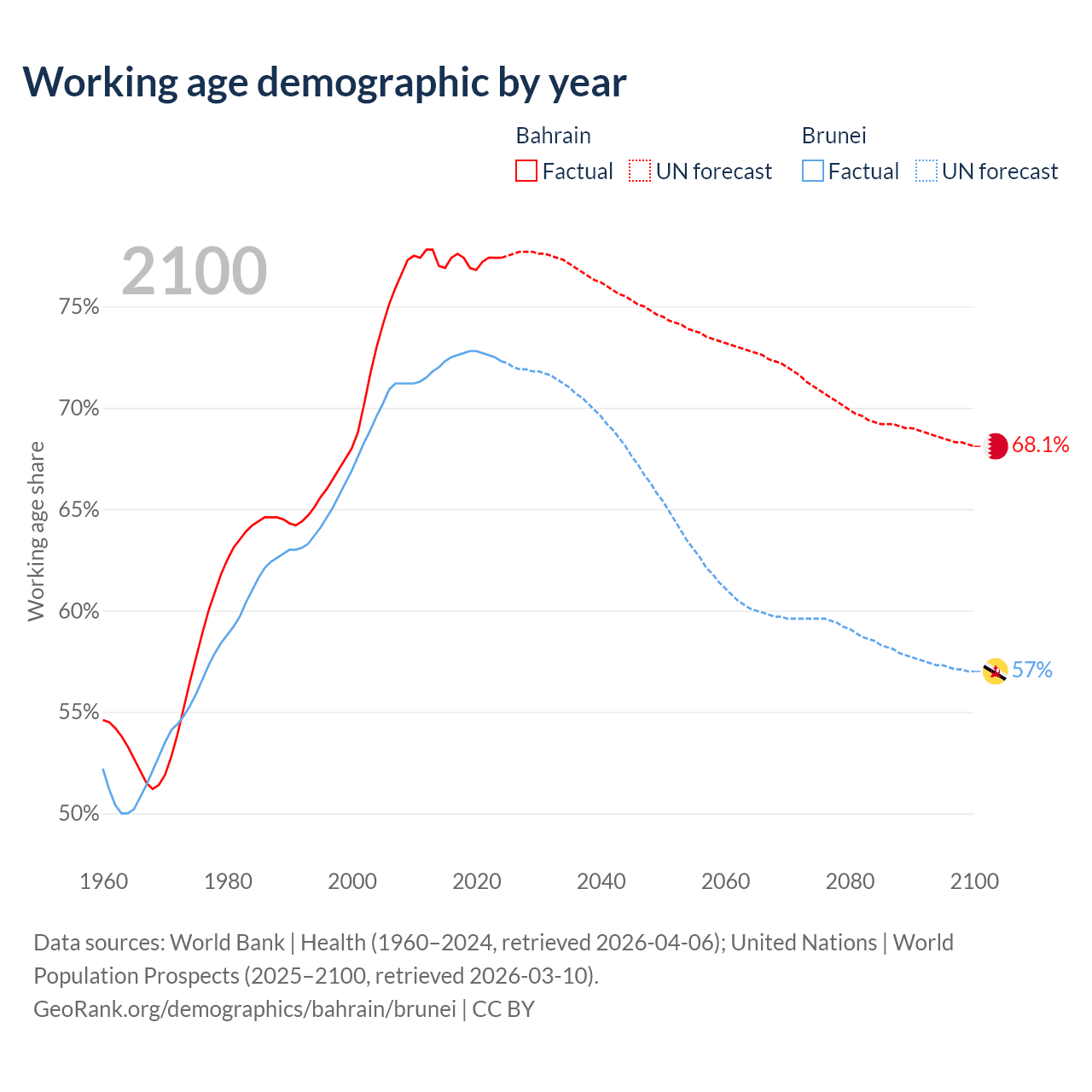 Median age Bahrain vs Brunei, 1960-2100