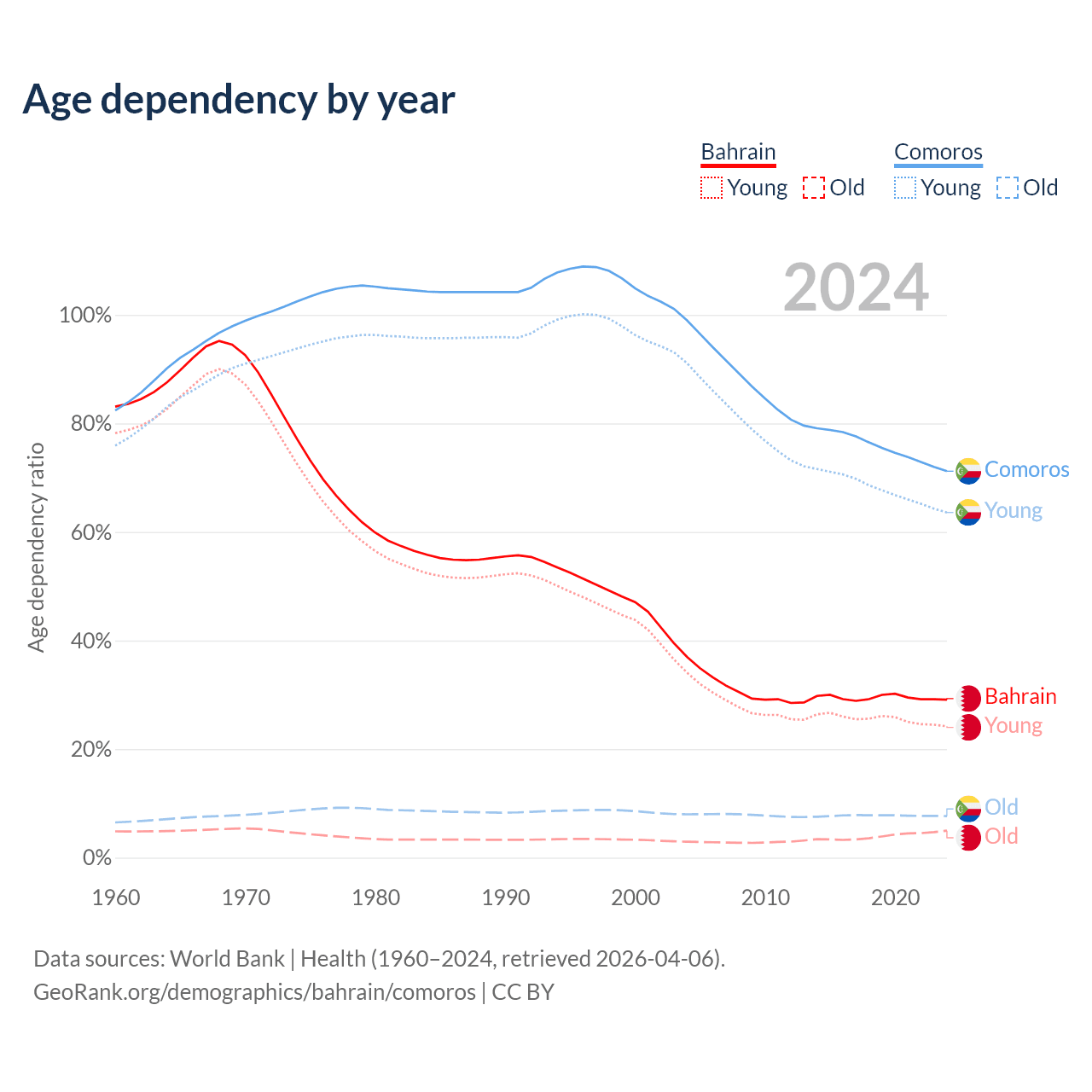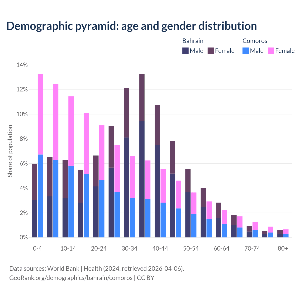 - Bahrain is ranked 80/196 by median age (oldest to youngest) vs 152/196 for Comoros.