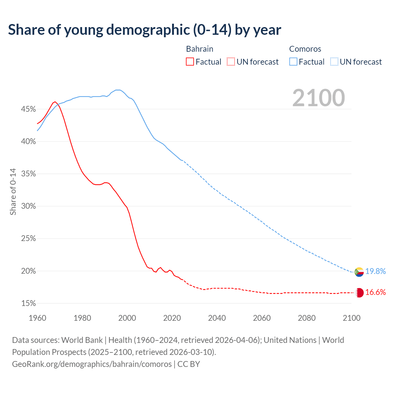 Median age Bahrain vs Comoros, 1960-2100