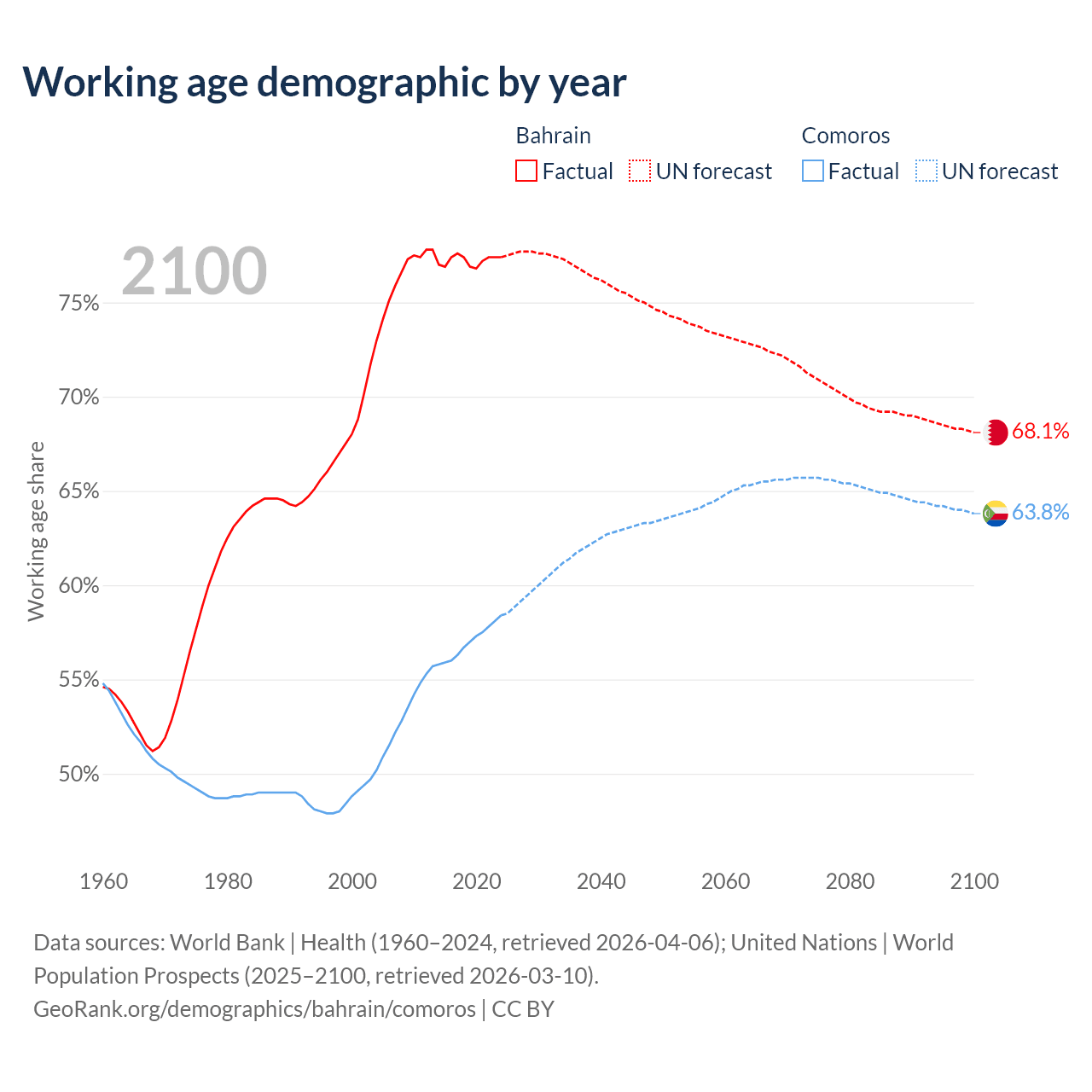 - Bahrain has 1.29M working age adults (aged 15-64) vs 528K in Comoros.