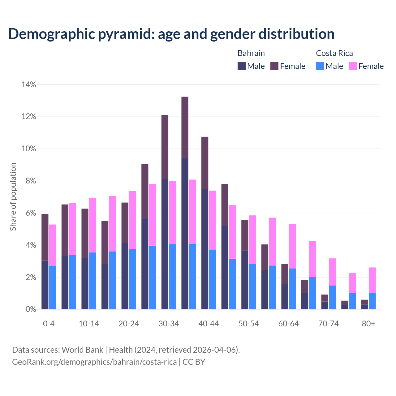 - Bahrain is ranked 80/196 by median age (oldest to youngest) vs 72/196 for Costa Rica.