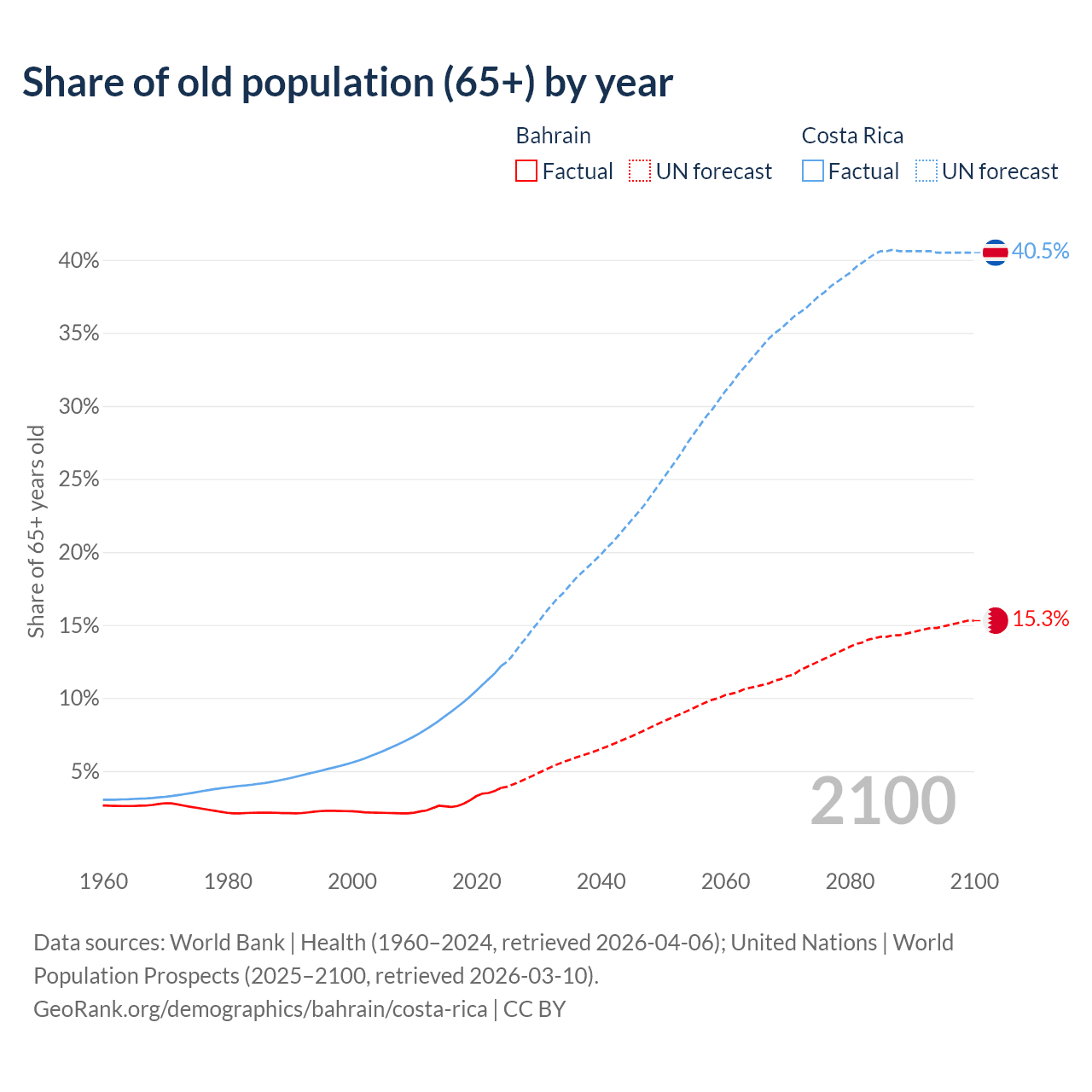 The share of older people aged 65 and over is 3.85% in Bahrain and 12.2% in Costa Rica. Life expectancy in Bahrain compared to Costa Rica .