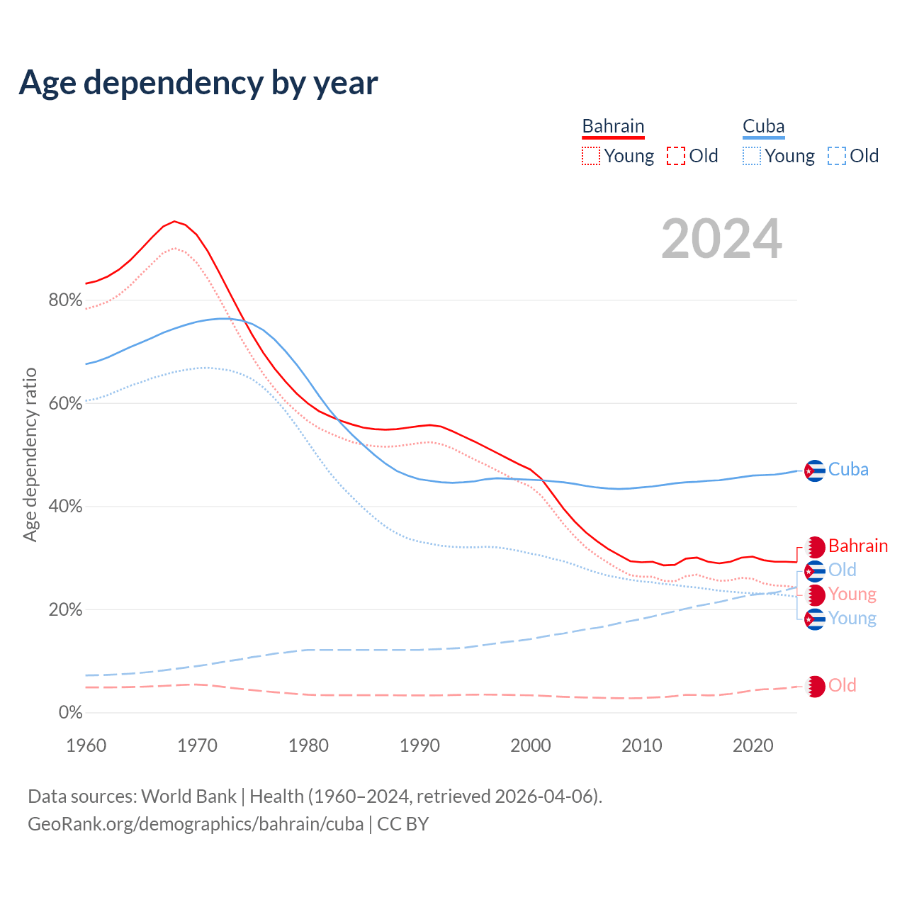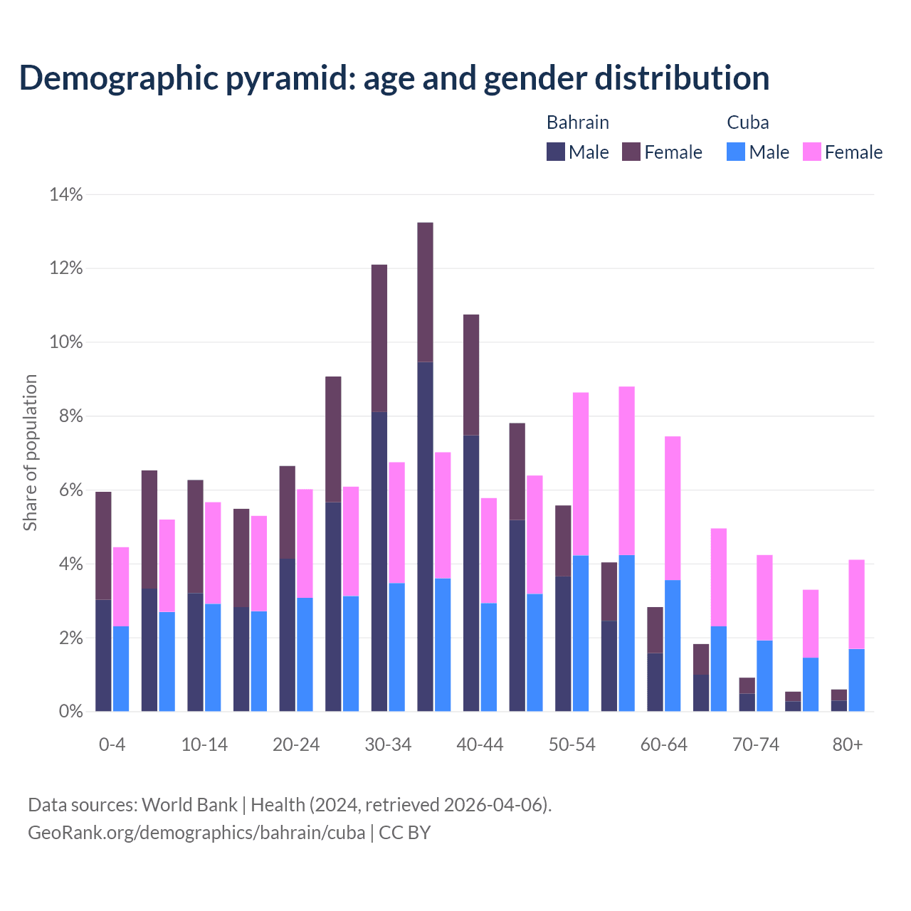 - Bahrain is ranked 80/196 by median age (oldest to youngest) vs 27/196 for Cuba.