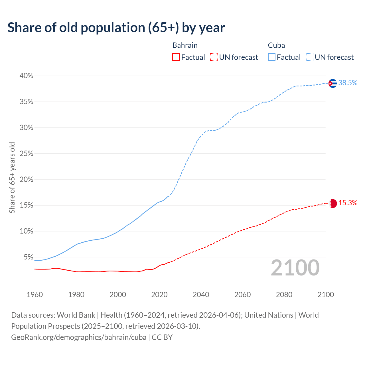 The share of older people aged 65 and over is 3.85% in Bahrain and 16.6% in Cuba. Life expectancy in Bahrain compared to Cuba .