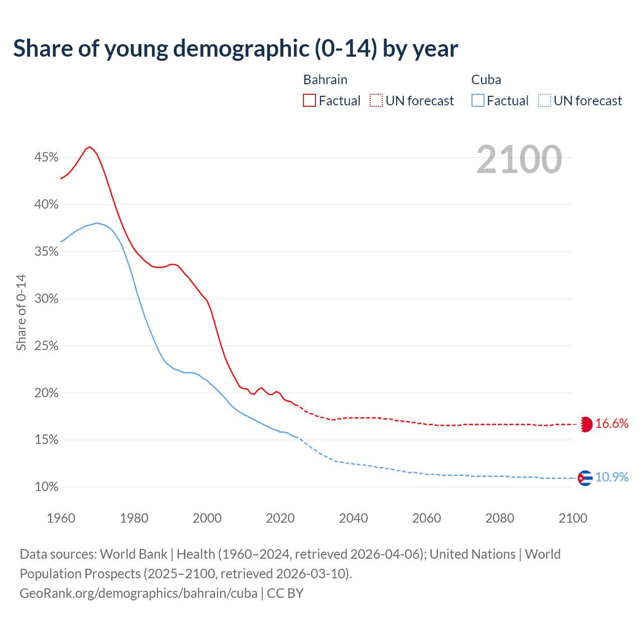 - The share of young demographic (0-15 years old) in Bahrain is 18.7% vs 15.3% in Cuba.