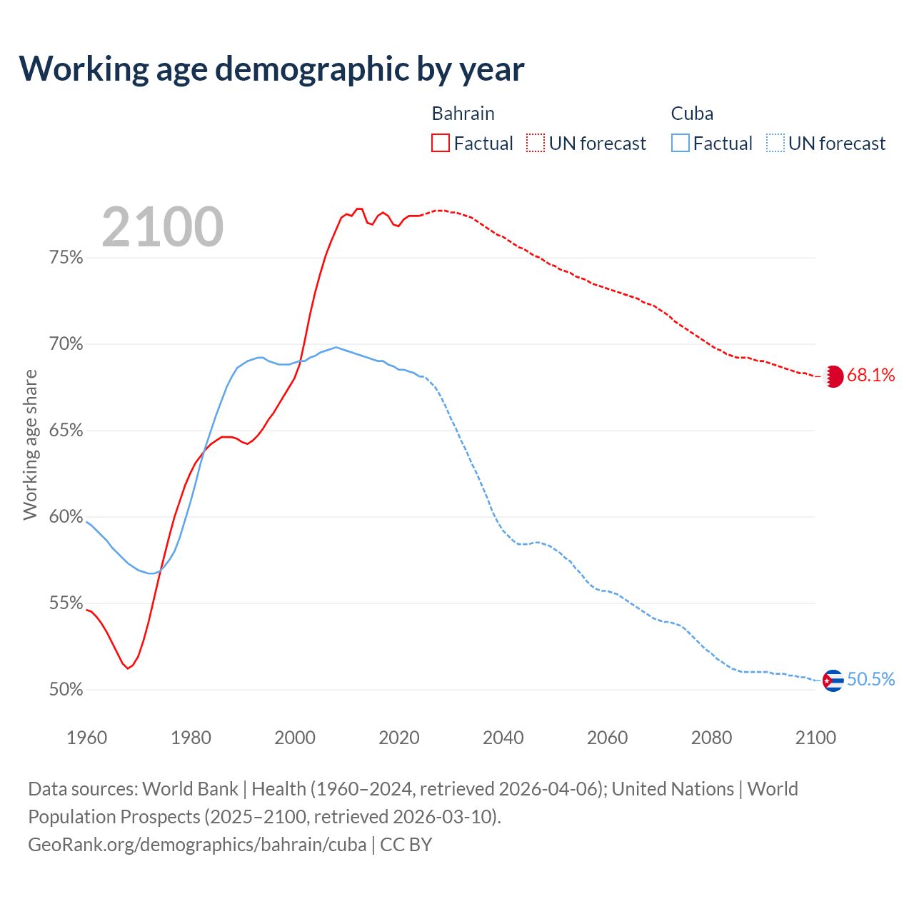- Bahrain has 1.29M working age adults (aged 15-64) vs 7.42M in Cuba.