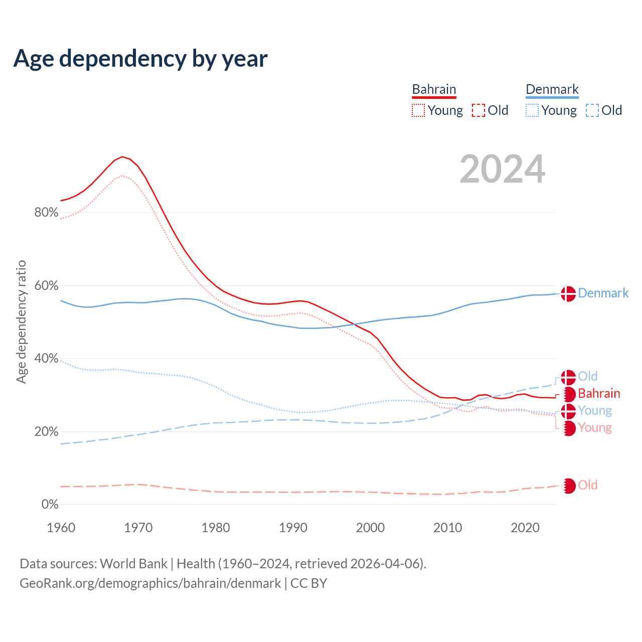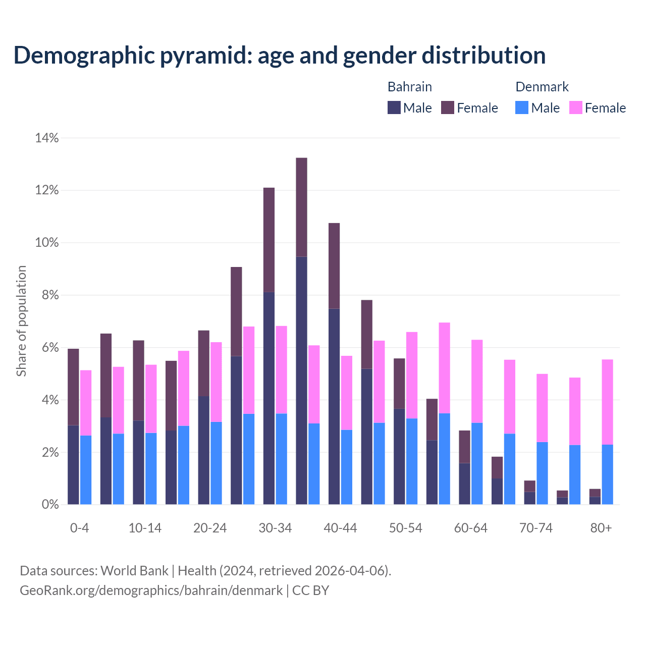 - Bahrain is ranked 80/196 by median age (oldest to youngest) vs 34/196 for Denmark.