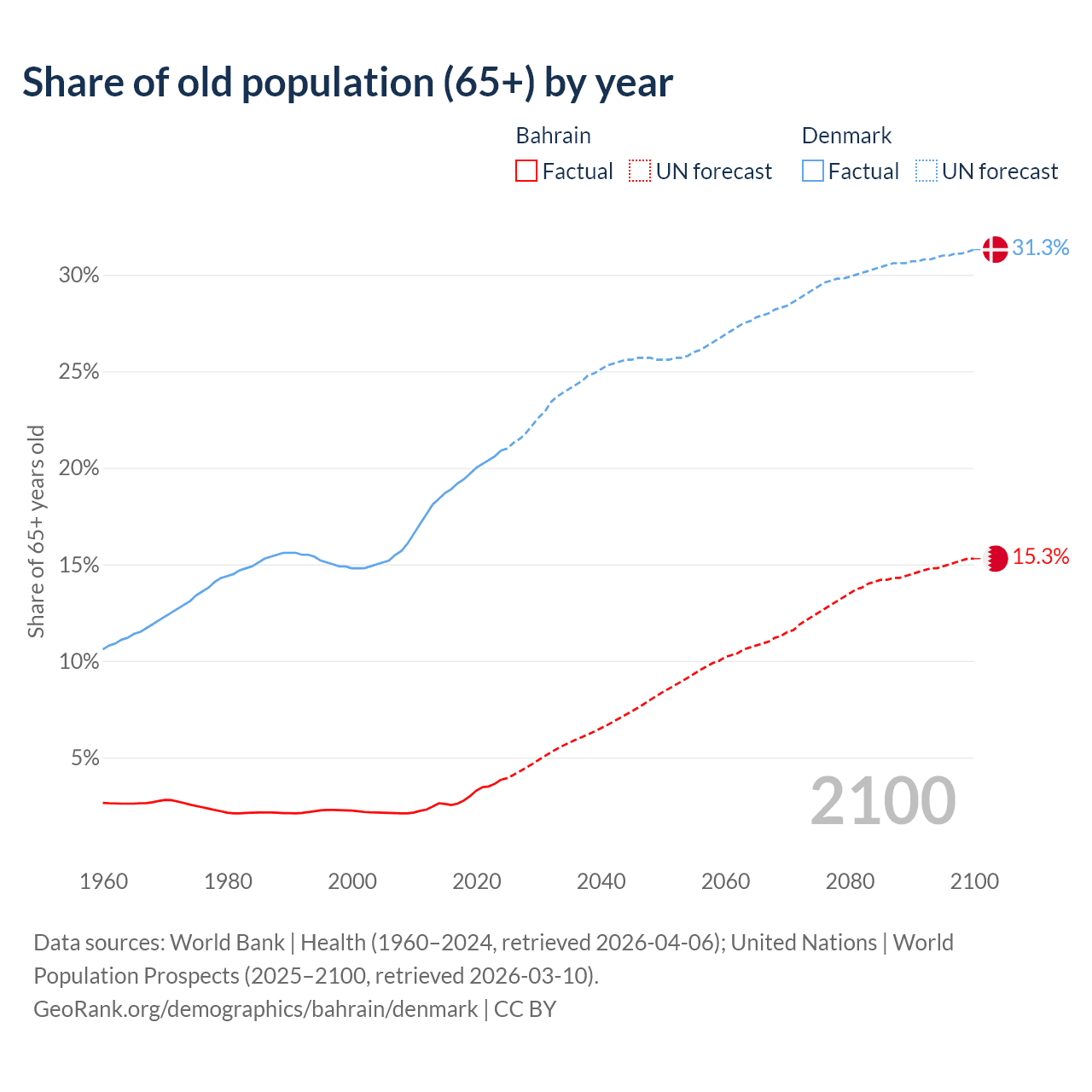 The share of older people aged 65 and over is 3.85% in Bahrain and 20.9% in Denmark. Life expectancy in Bahrain compared to Denmark .