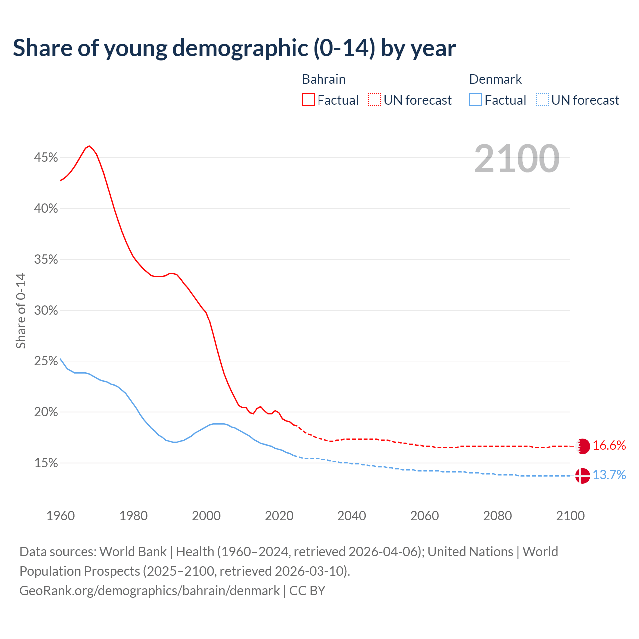 - The share of young demographic (0-15 years old) in Bahrain is 18.7% vs 15.7% in Denmark.