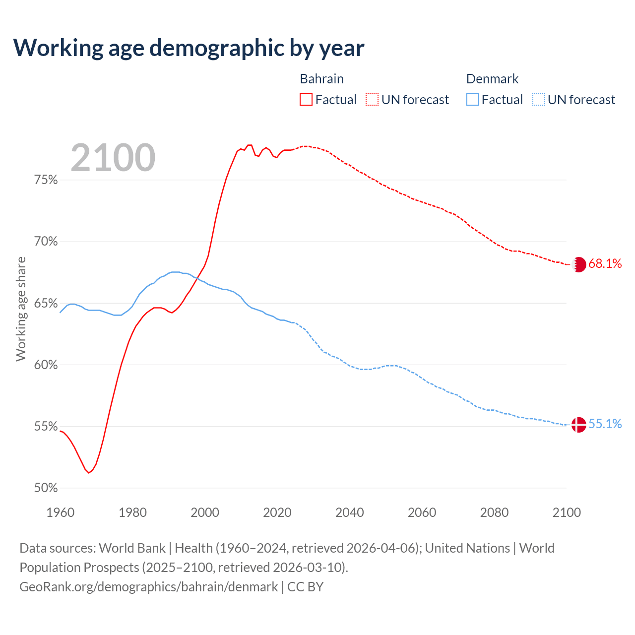 Median age Bahrain vs Denmark, 1960-2100