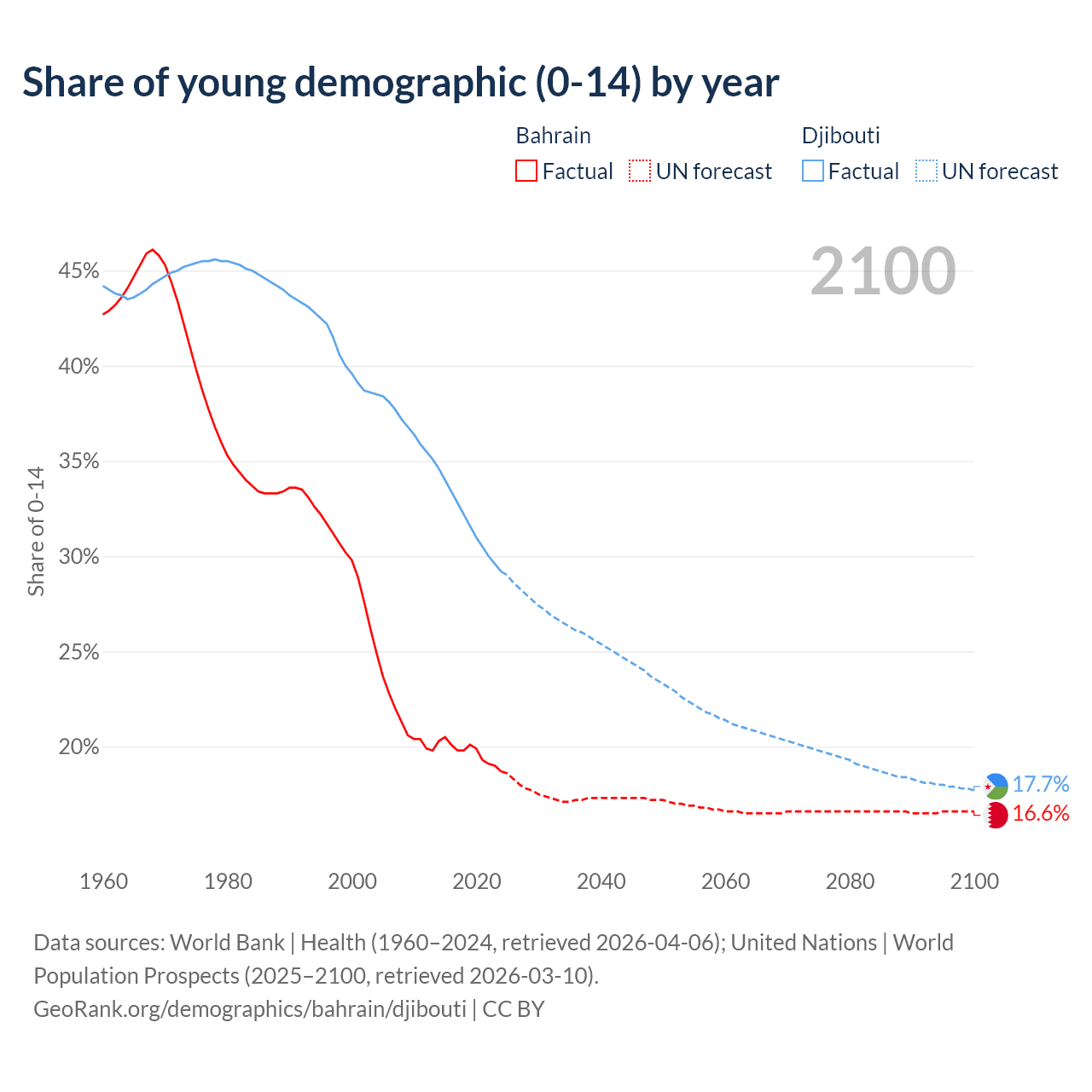 Median age Bahrain vs Djibouti, 1960-2100