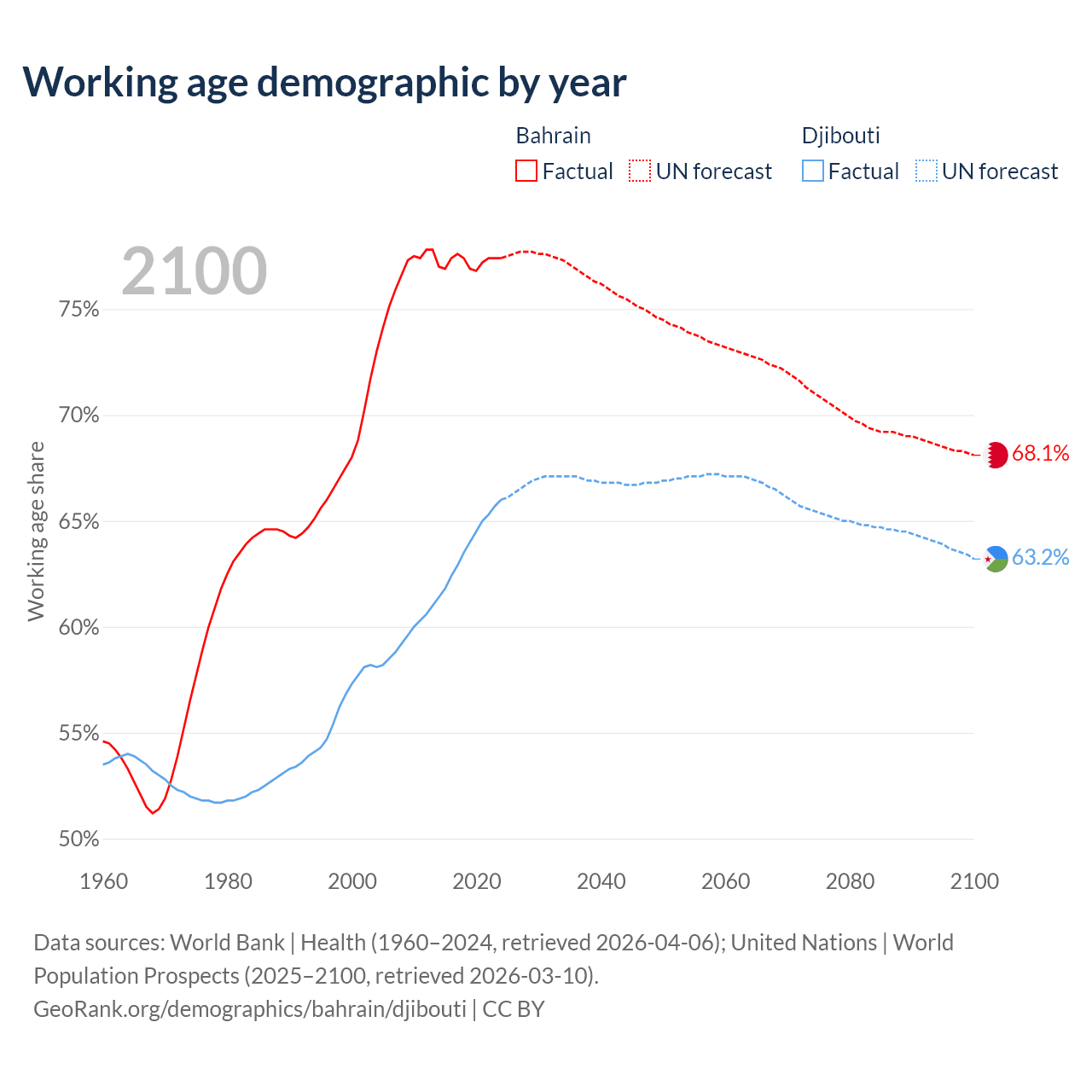- Bahrain has 1.29M working age adults (aged 15-64) vs 794K in Djibouti.