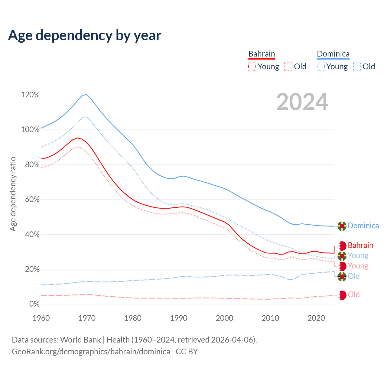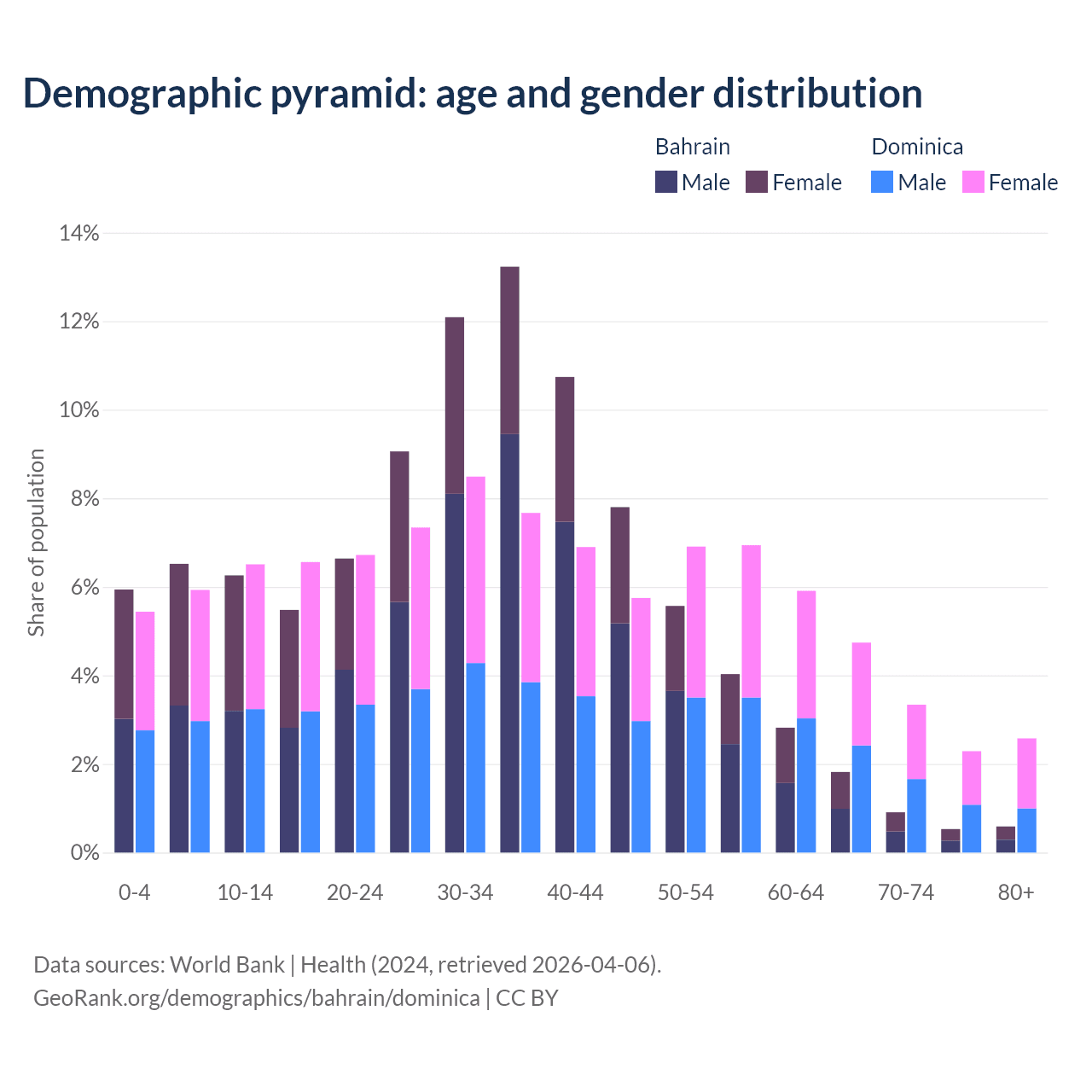 - Bahrain is ranked 80/196 by median age (oldest to youngest) vs 66/196 for Dominica.