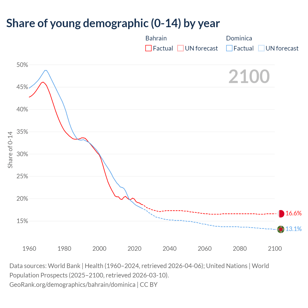 - The share of young demographic (0-15 years old) in Bahrain is 18.7% vs 17.9% in Dominica.