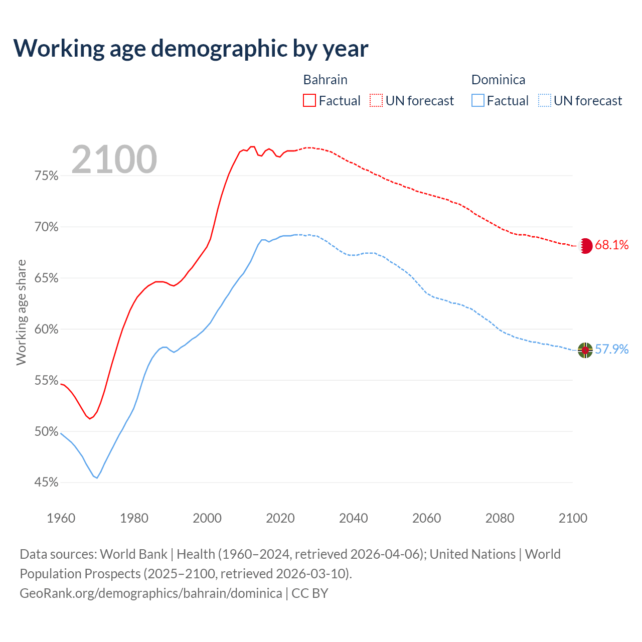 - Bahrain has 1.29M working age adults (aged 15-64) vs 45.3K in Dominica.