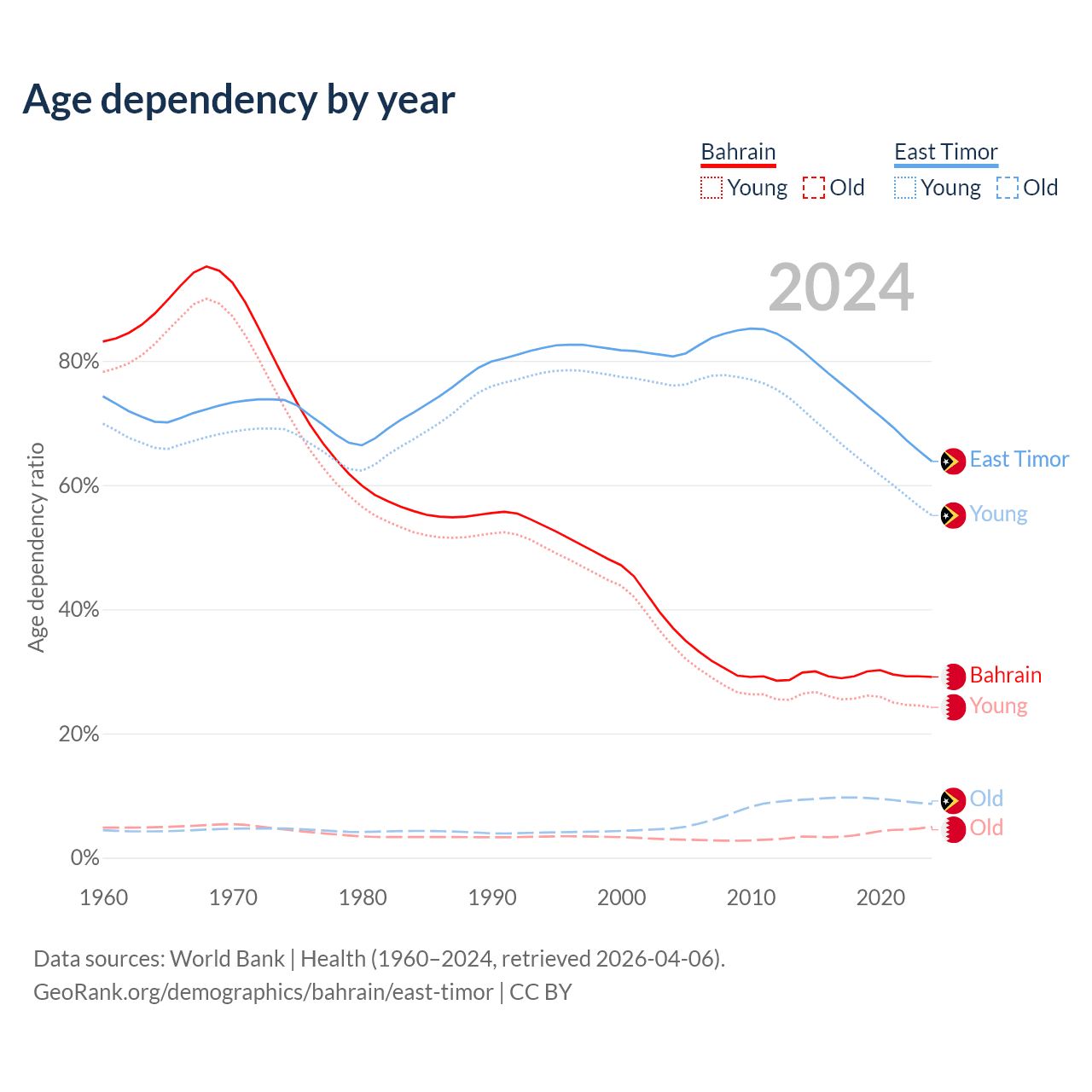 - Bahrain is ranked 80/196 by median age (oldest to youngest) vs 145/196 for East Timor.