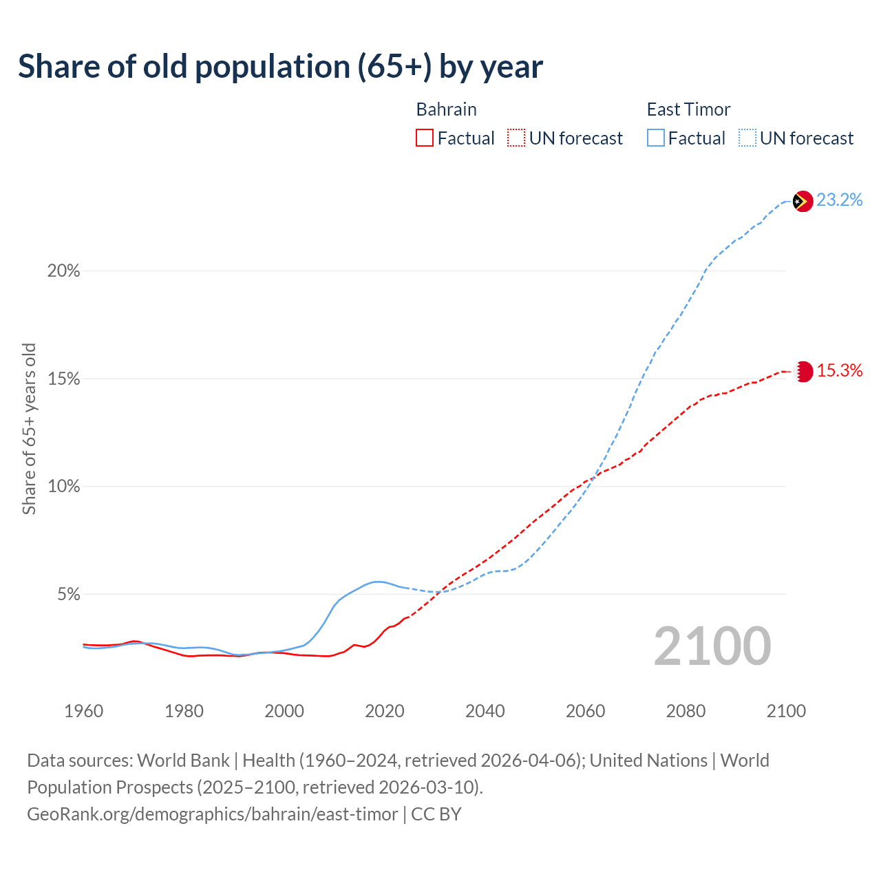 - The share of old-age demographic (65+) in Bahrain is 3.85% vs 5.28% in East Timor.