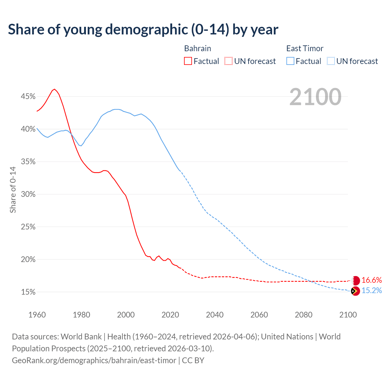- The share of young demographic (0-15 years old) in Bahrain is 18.7% vs 33.7% in East Timor.