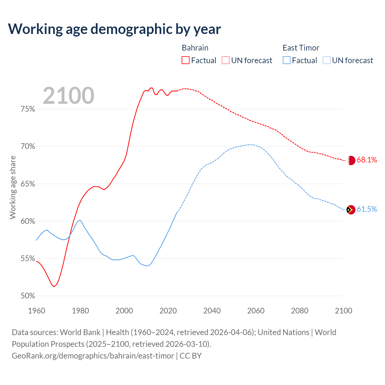 - Bahrain has 1.29M working age adults (aged 15-64) vs 880K in East Timor.