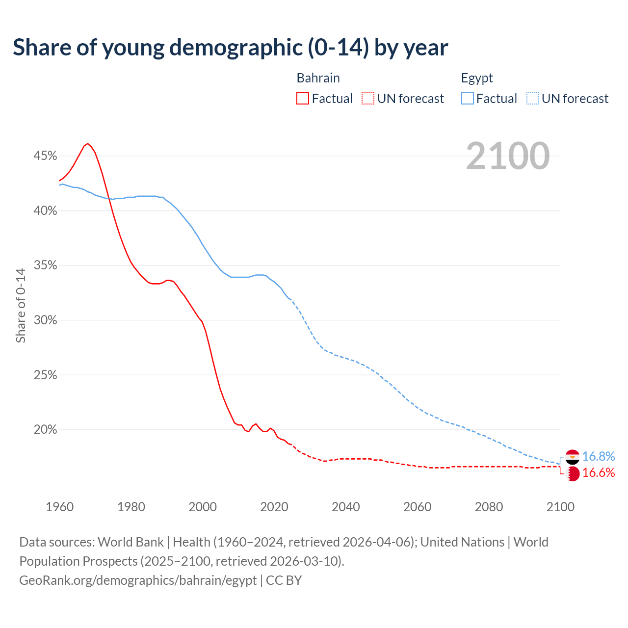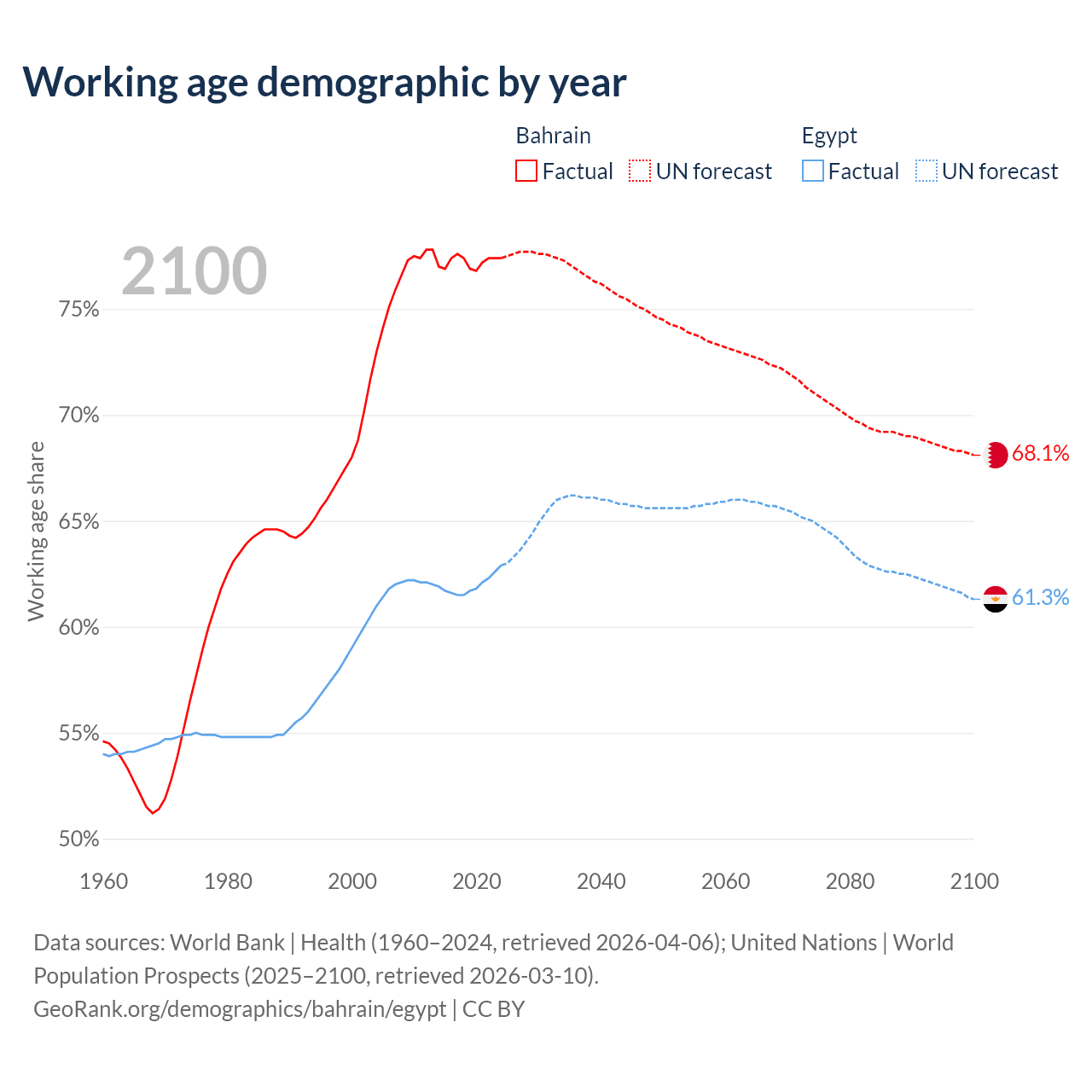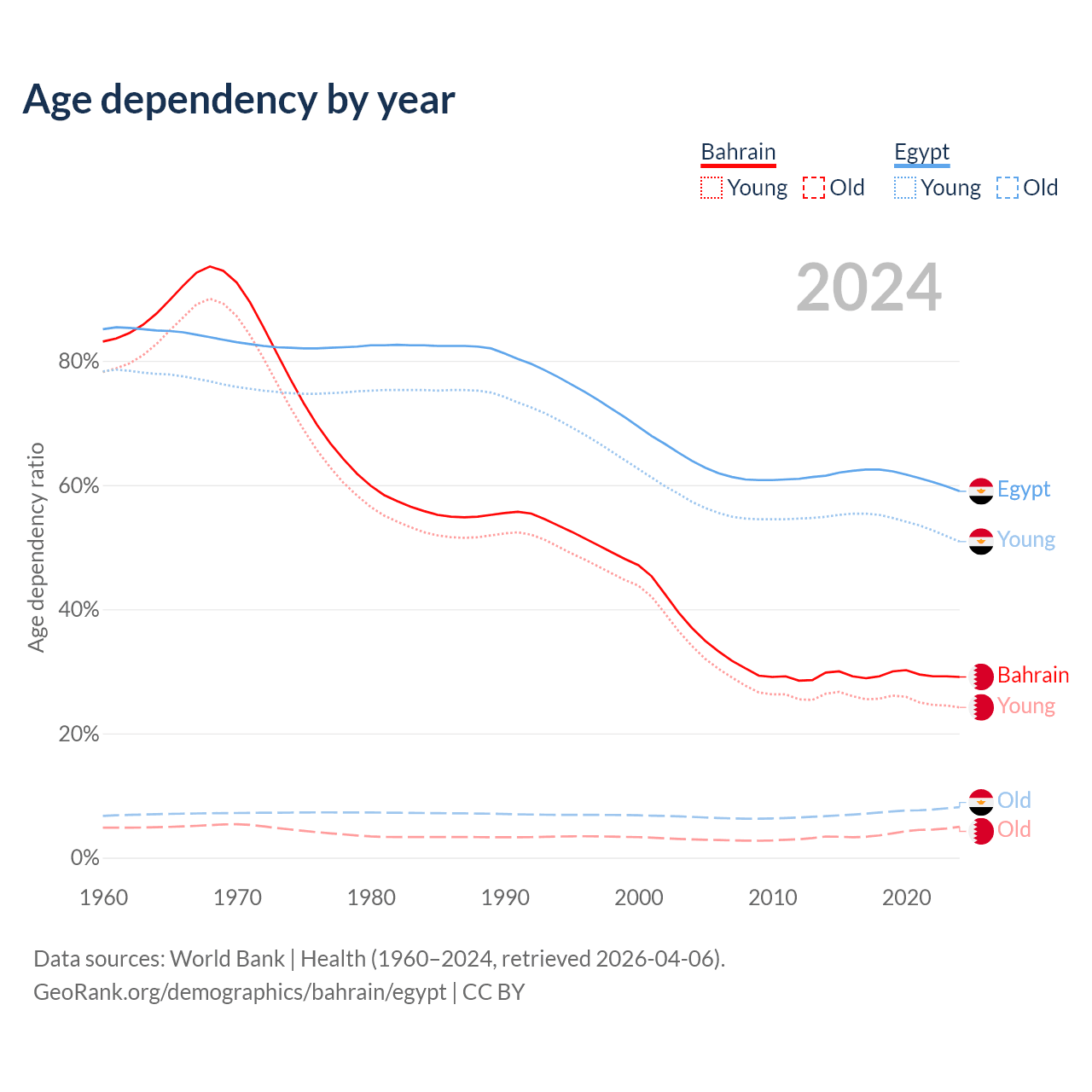 - Bahrain is ranked 80/196 by median age (oldest to youngest) vs 133/196 for Egypt.