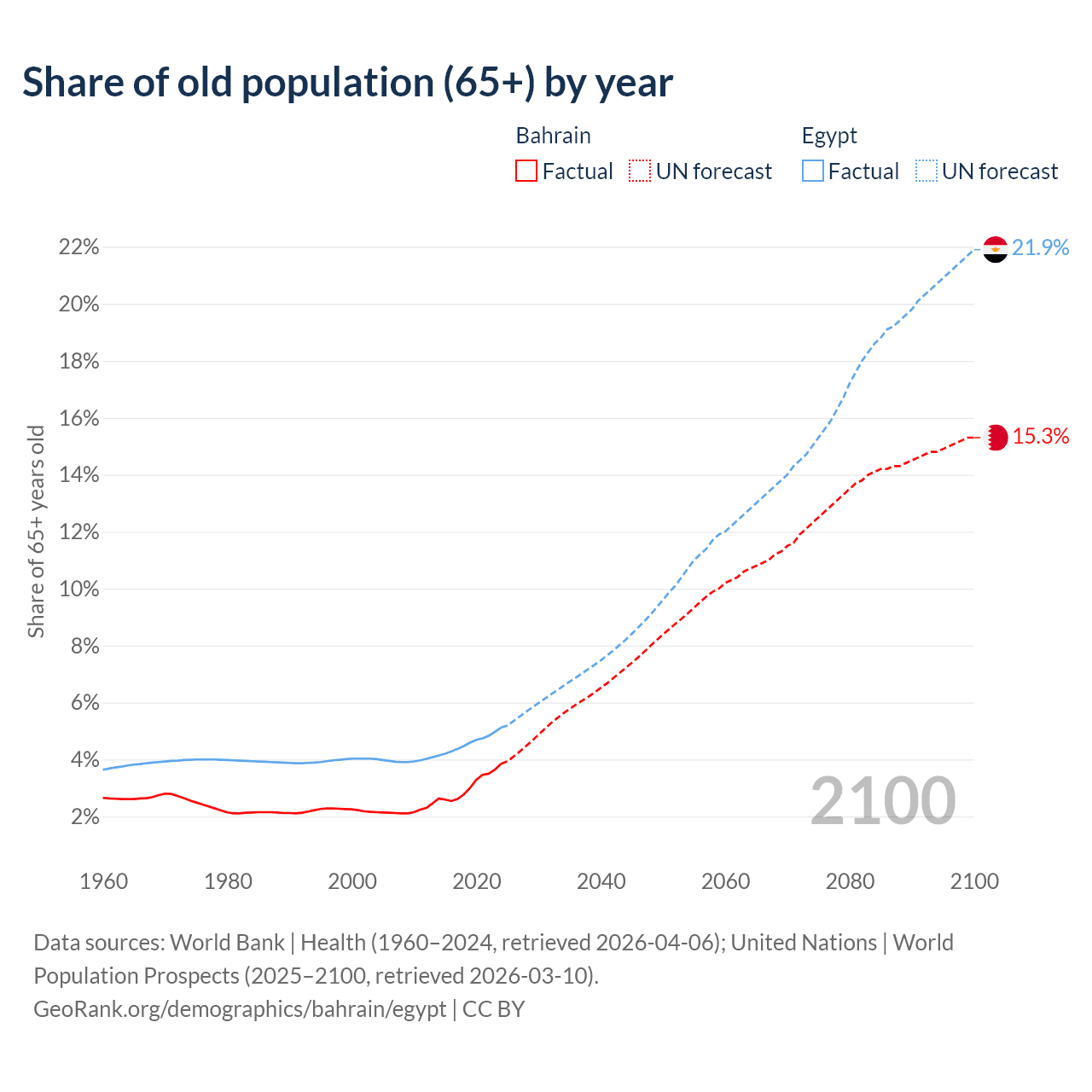 The share of older people aged 65 and over is 3.85% in Bahrain and 5.12% in Egypt. Life expectancy in Bahrain compared to Egypt .
