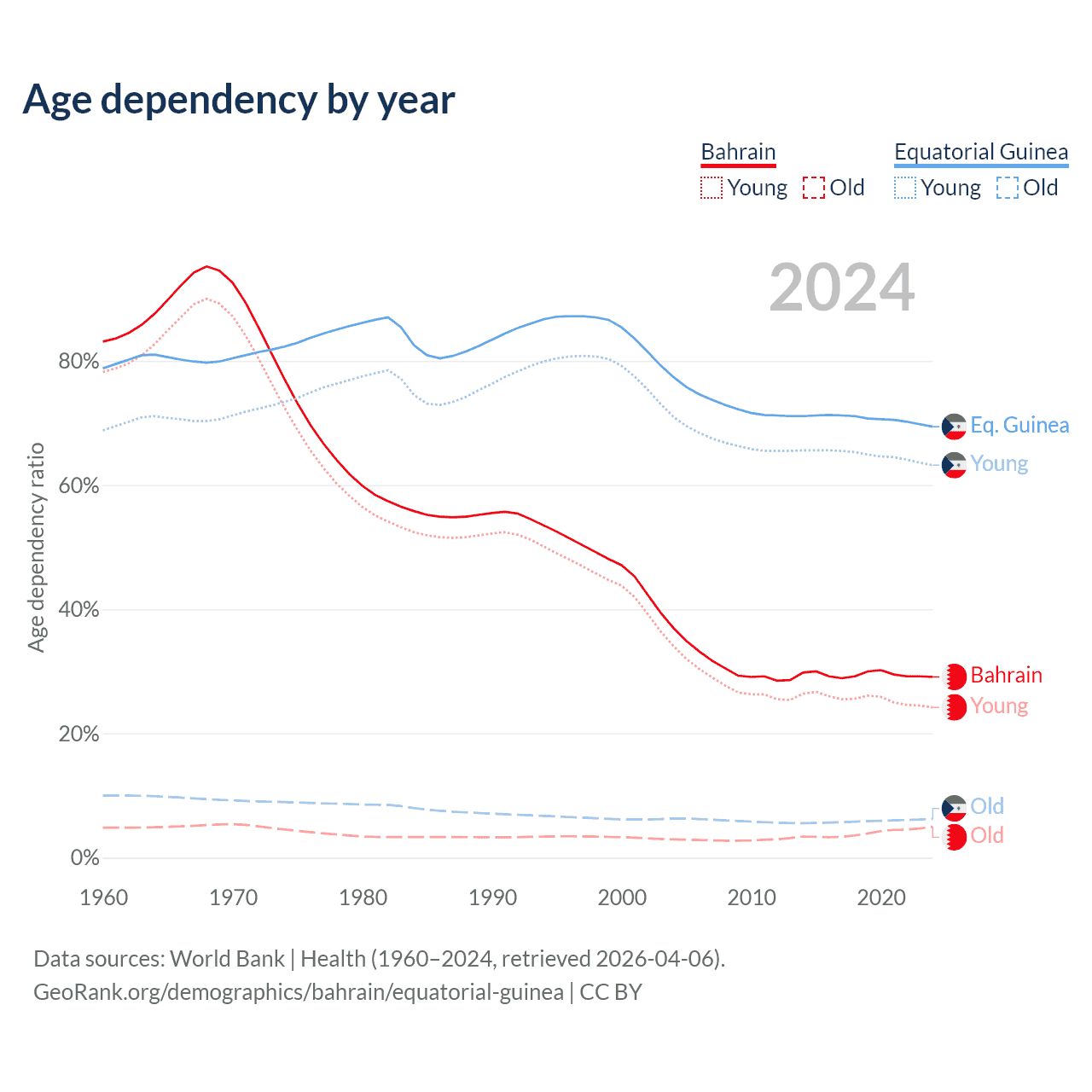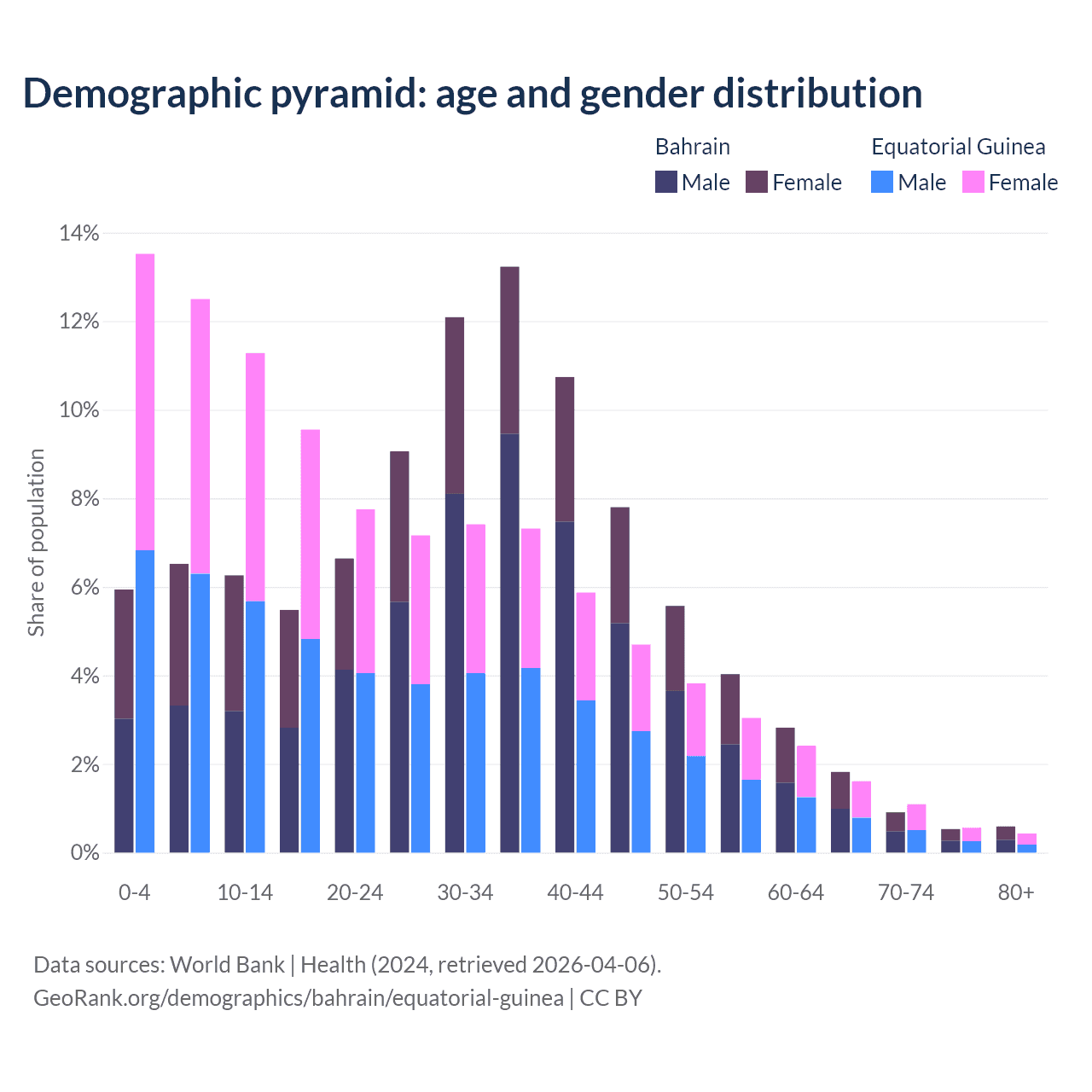 - Bahrain is ranked 80/196 by median age (oldest to youngest) vs 148/196 for Equatorial Guinea.