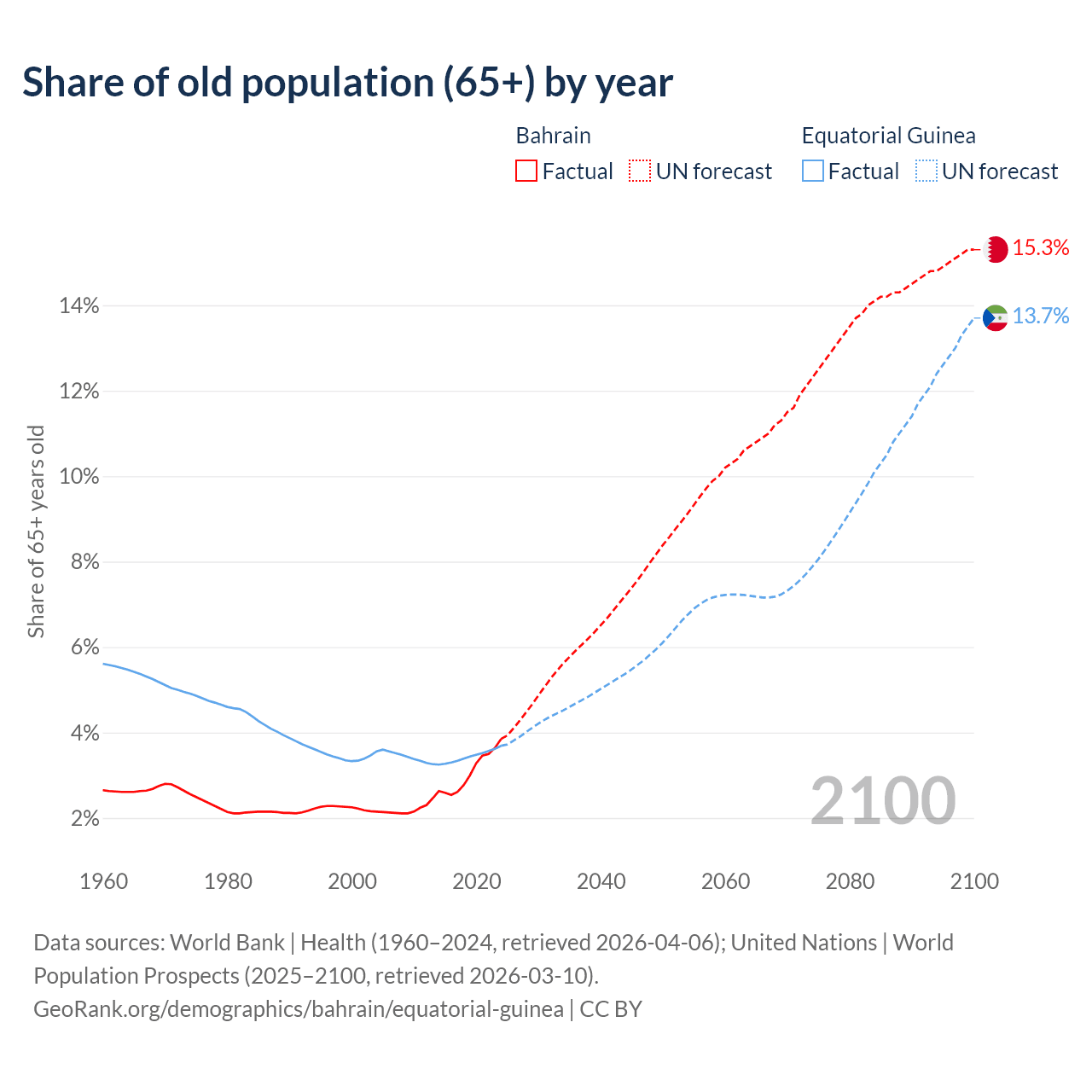 - The share of old-age demographic (65+) in Bahrain is 3.85% vs 3.69% in Equatorial Guinea.