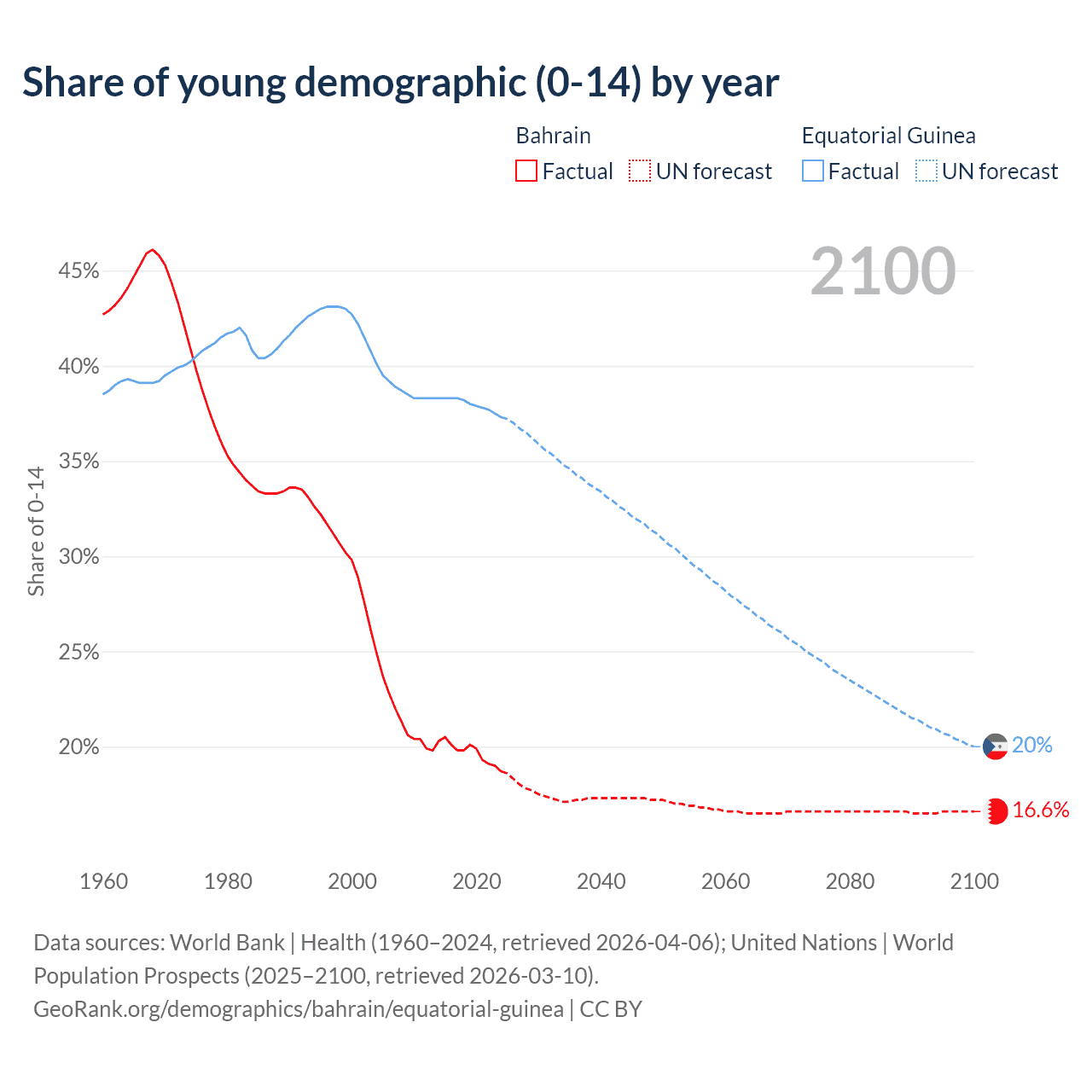 - The share of young demographic (0-15 years old) in Bahrain is 18.7% vs 37.3% in Equatorial Guinea.