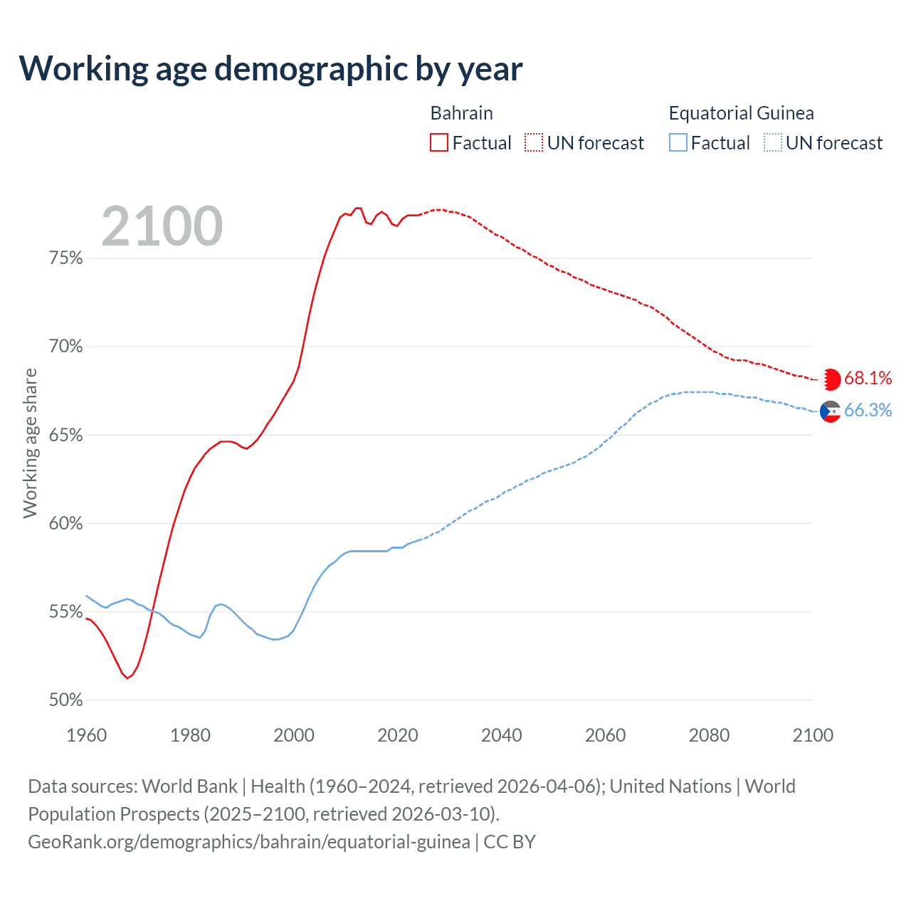 - Bahrain has 1.29M working age adults (aged 15-64) vs 1.18M in Equatorial Guinea.