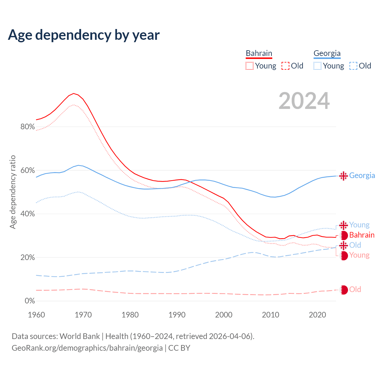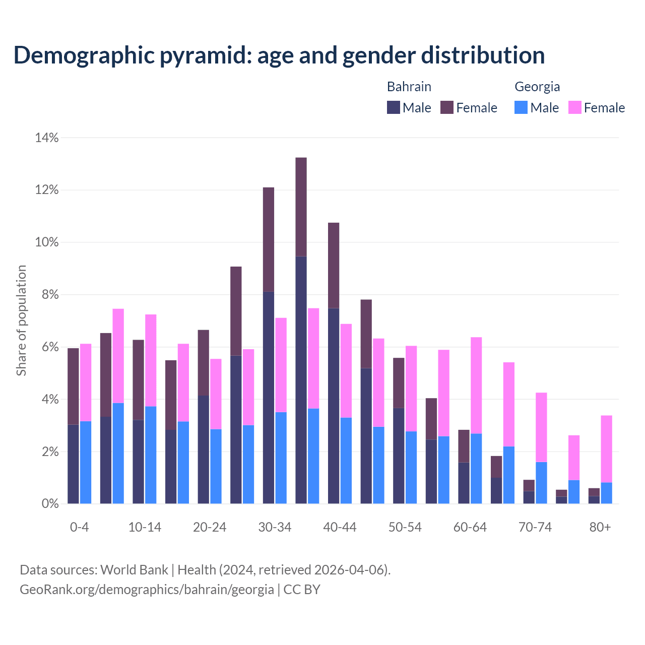 - Bahrain is ranked 80/196 by median age (oldest to youngest) vs 59/196 for Georgia.