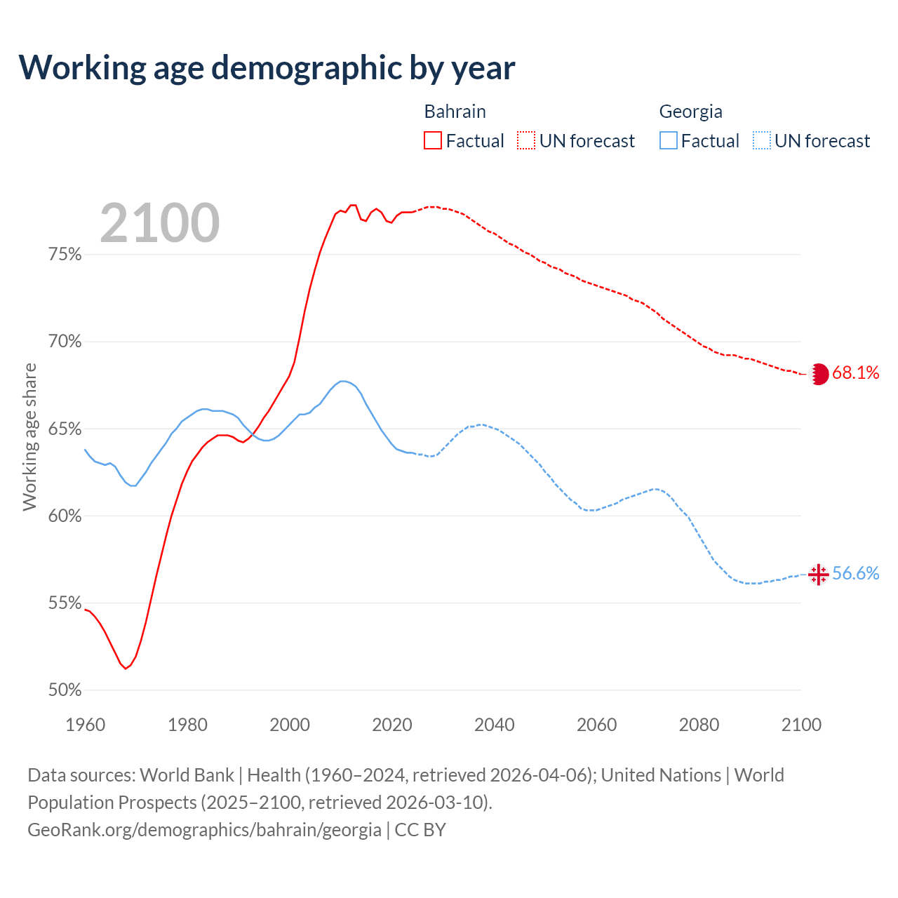 - Bahrain has 1.29M working age adults (aged 15-64) vs 2.35M in Georgia.