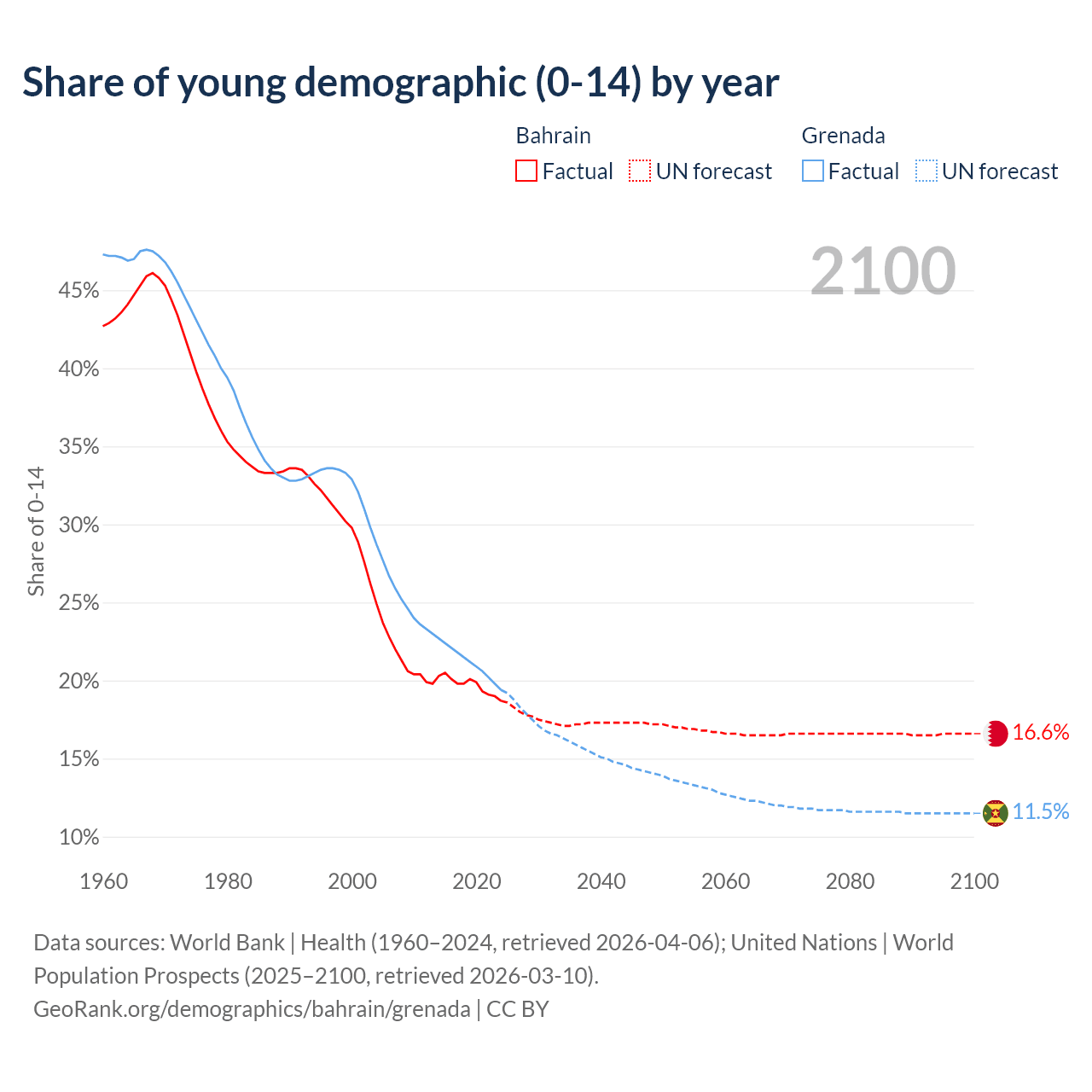 - The share of young demographic (0-15 years old) in Bahrain is 18.7% vs 19.4% in Grenada.
