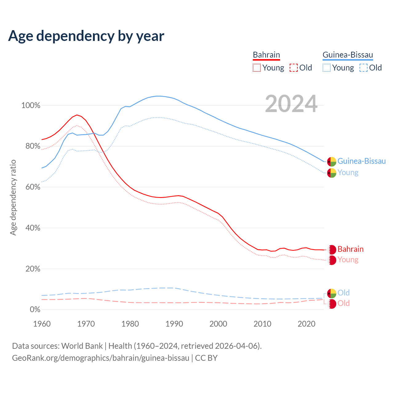 - Bahrain is ranked 80/196 by median age (oldest to youngest) vs 164/196 for Guinea-Bissau.