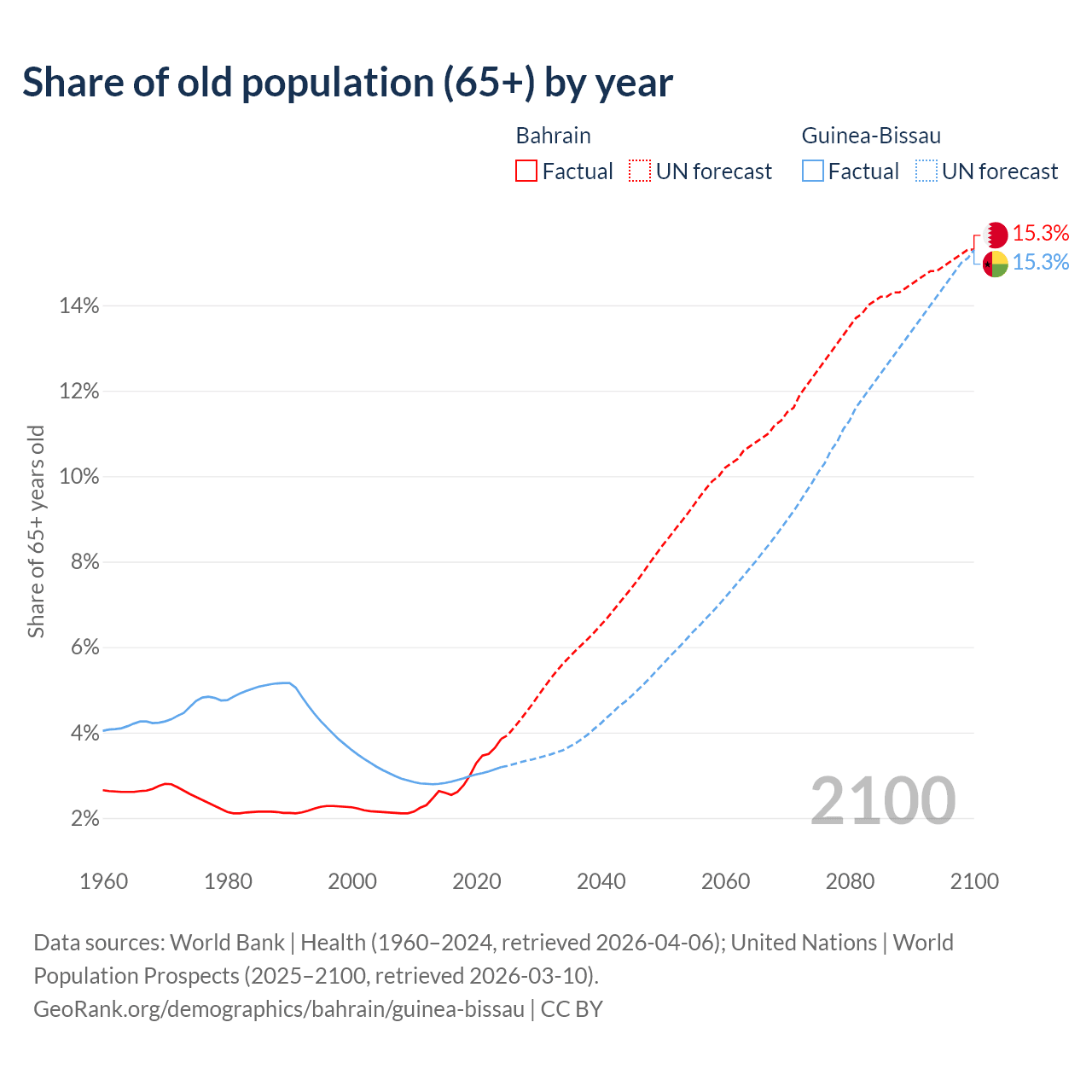 The share of older people aged 65 and over is 3.85% in Bahrain and 3.19% in Guinea-Bissau. Life expectancy in Bahrain compared to Guinea-Bissau .
