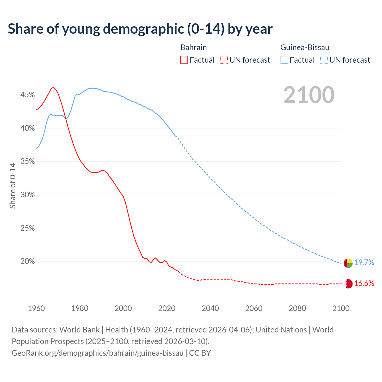 - The share of young demographic (0-15 years old) in Bahrain is 18.7% vs 38.8% in Guinea-Bissau.